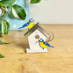 This charming birdhouse decoration is crafted from painted wood with a gently weathered finish and topped with a rustic metal roof. Featuring two cheerful blue tit birds and a subtle heart detail on the front, it brings a fresh spring feel to shelves, windowsills or hanging displays. Lightweight yet sturdy, it can be displayed freestanding or hung using the attached twine loop, making it easy to style around the home. A lovely decorative accent with countryside character, ideal for Mother’s Day gifting and mums who love birds, gardens and nature-inspired décor.