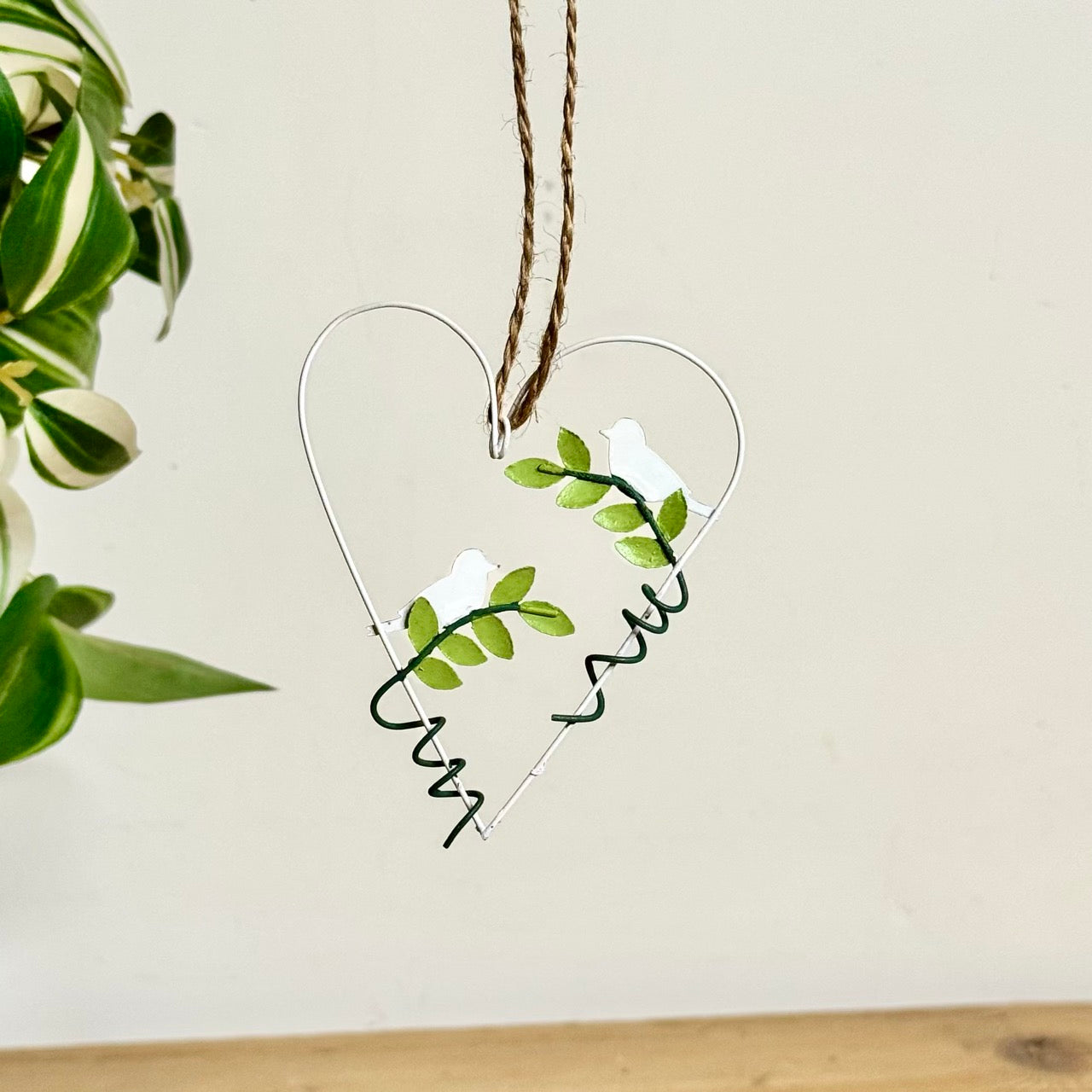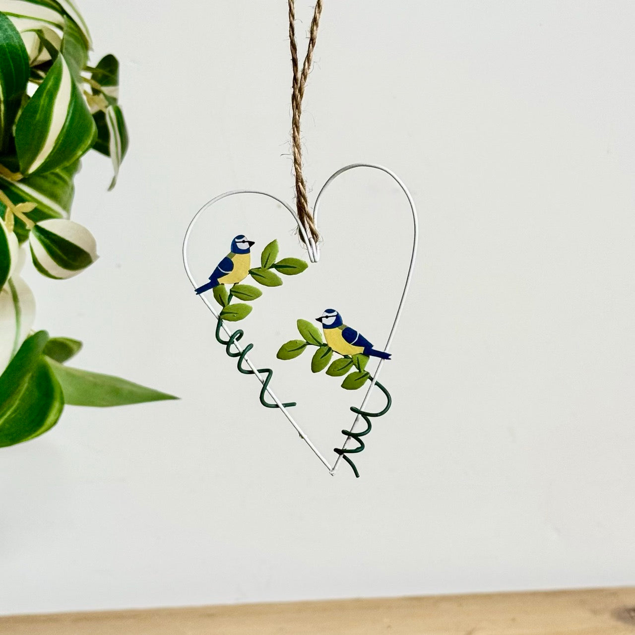 • Features: Heart-shaped wire design, two blue tit birds, leaf detailing, hanging twine loop