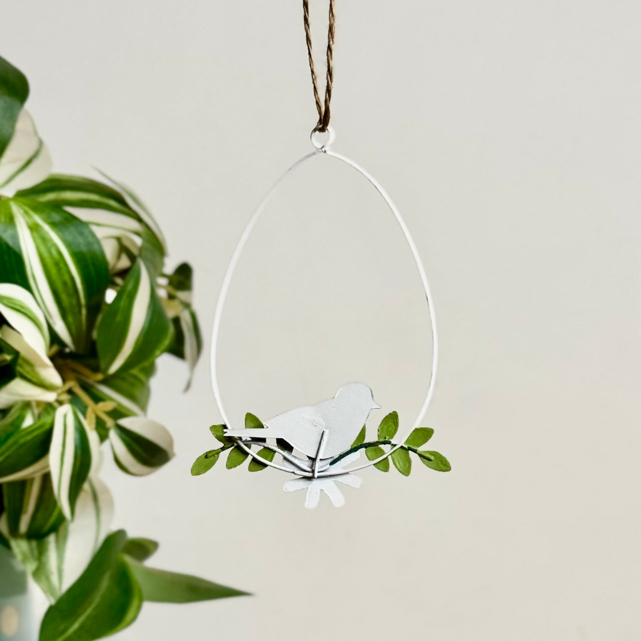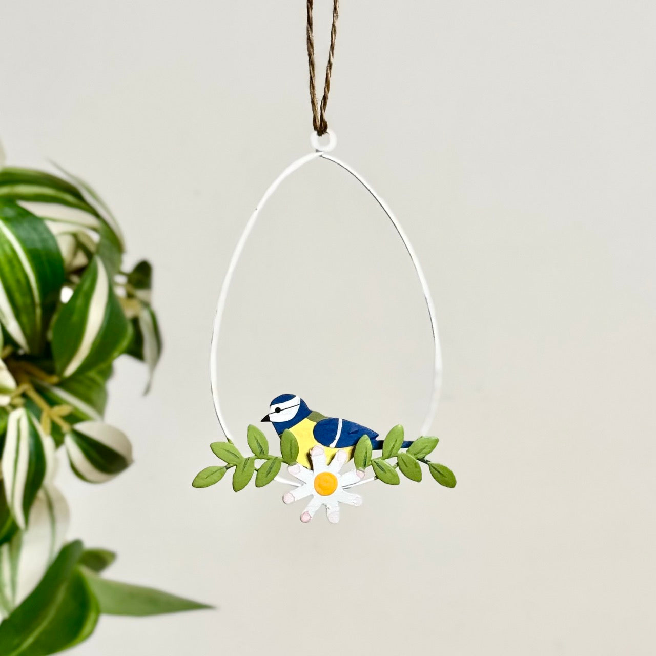 Features: Egg-shaped wire frame, blue tit bird detail, leaf and daisy design, hanging twine loop
