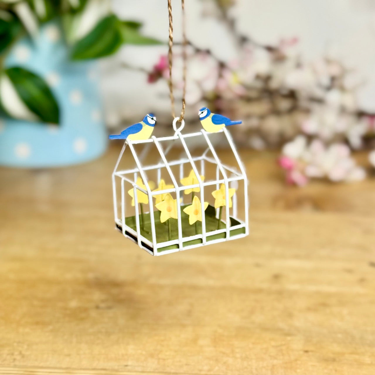 This delightful mini flower cage decoration is crafted from painted metal and twine, featuring cheerful daffodils nestled inside and two bright blue tit birds perched on top. Finished with a soft spring colour palette and rustic twine for hanging, it brings a fresh, countryside feel to shelves, hooks or windowsills. Lightweight yet sturdy, it can be displayed freestanding or hung with ease. Full of charm and seasonal character, it’s ideal for those who love birds, gardens and joyful spring décor.