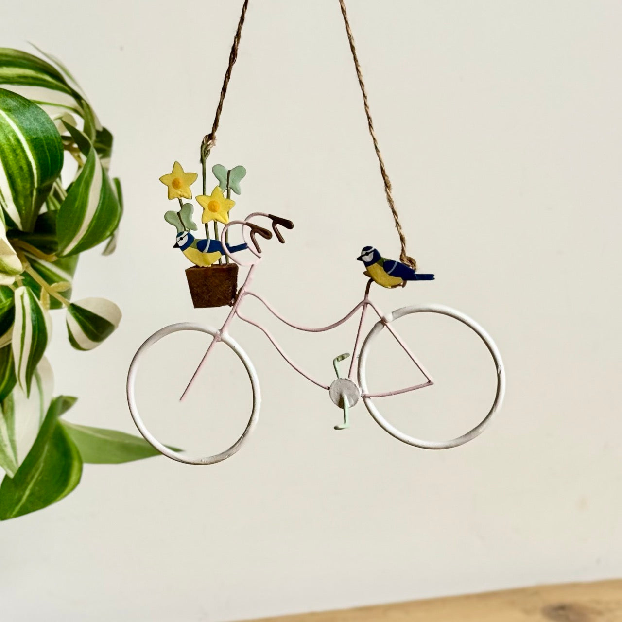 This charming bicycle decoration is crafted from painted metal wire and finished in soft pastel tones for a light, countryside-inspired look. Featuring two cheerful blue tit birds and a tiny floral basket with spring flowers, it adds gentle movement and personality to your décor. Lightweight and easy to display, it hangs neatly from the attached rustic twine, making it perfect for hooks, shelves or indoor plant styling. Designed purely for decorative use, it brings a fresh seasonal feel without overwhelming your space — ideal for bird lovers and fans of quirky, nature-inspired home accessories.