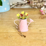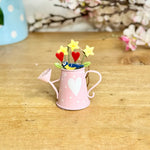 This sweet miniature watering can decoration is crafted from painted metal and finished in soft pink with delicate white polka dots and a heart motif. Filled with cheerful spring details including tiny flowers, heart stems and a little bird, it’s a compact piece that adds instant charm to shelves, windowsills or wall hooks. Lightweight yet sturdy, it can be displayed freestanding or hung using the attached twine loop, making it easy to style in different spaces. A thoughtful little keepsake that feels uplifting and personal, ideal for Mother’s Day gifting or for mums who adore floral décor with character.