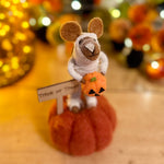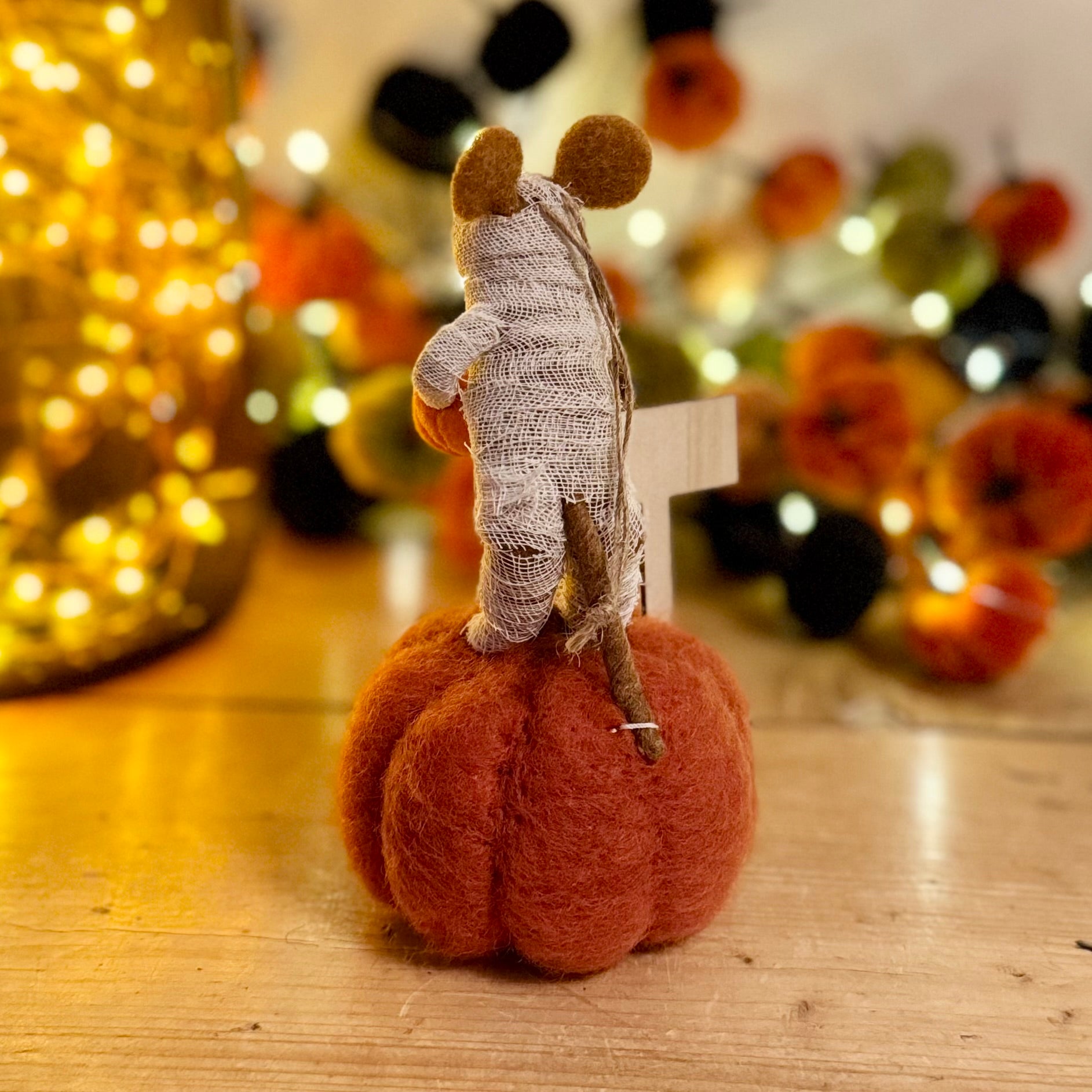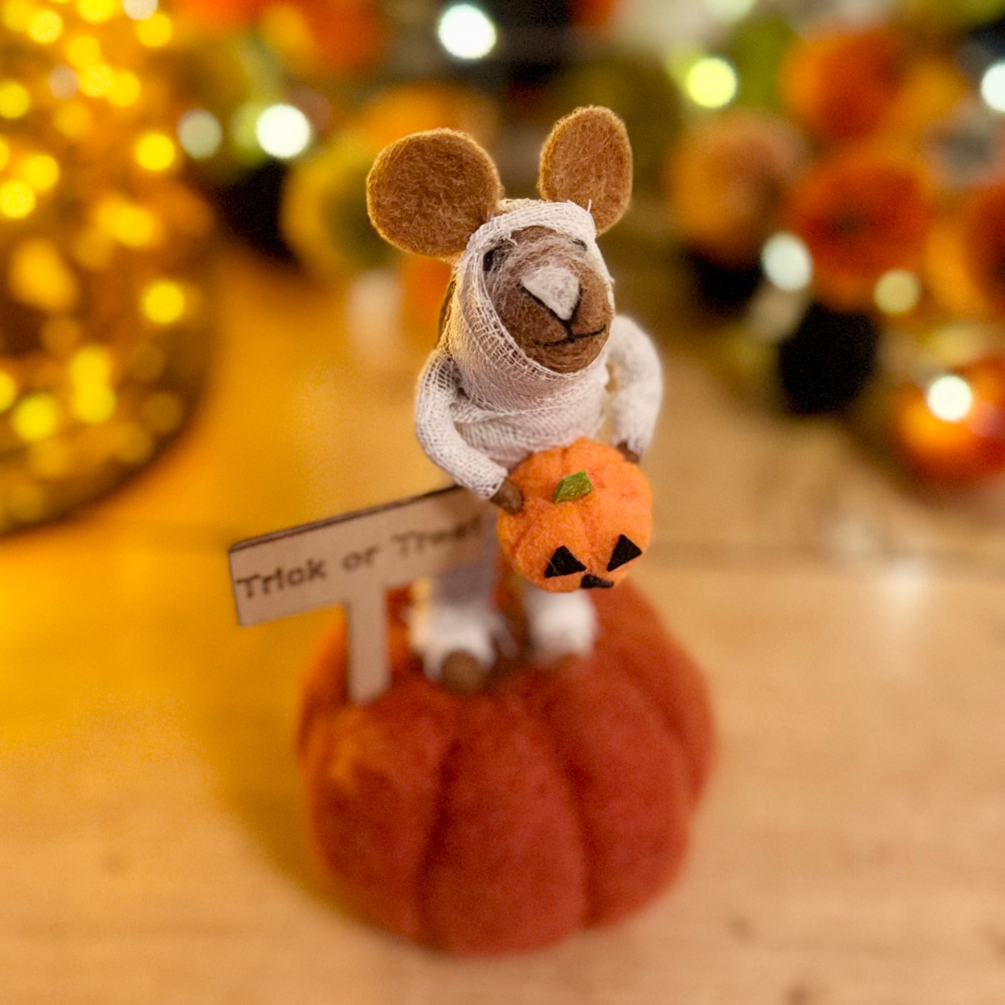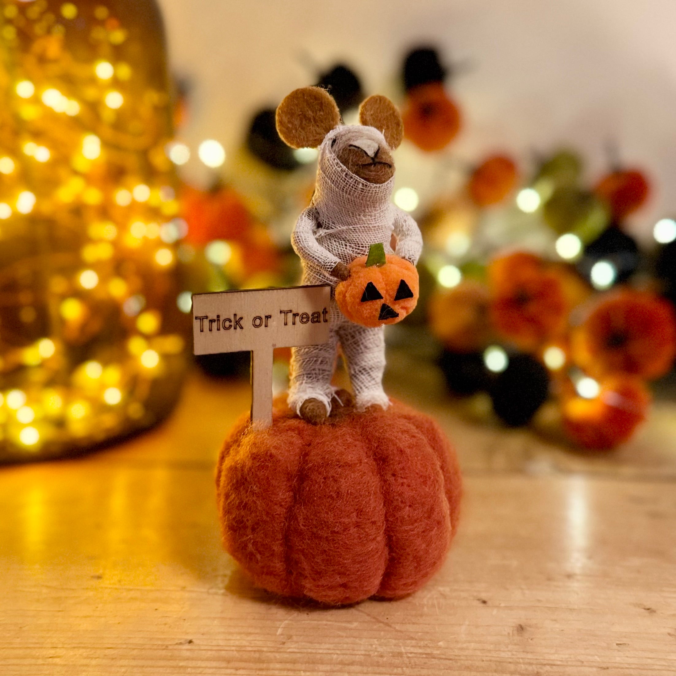All wrapped up and ready for mischief, this felted mummy mouse stands on a plump autumn pumpkin, holding a tiny jack-o’-lantern pumpkin. Complete with a wooden “Trick or Treat” sign, it’s a playful blend of autumn charm and Halloween spirit. A quirky, handmade decoration that works perfectly on shelves, sideboards or seasonal displays, bringing character to your autumn home décor and Halloween styling.