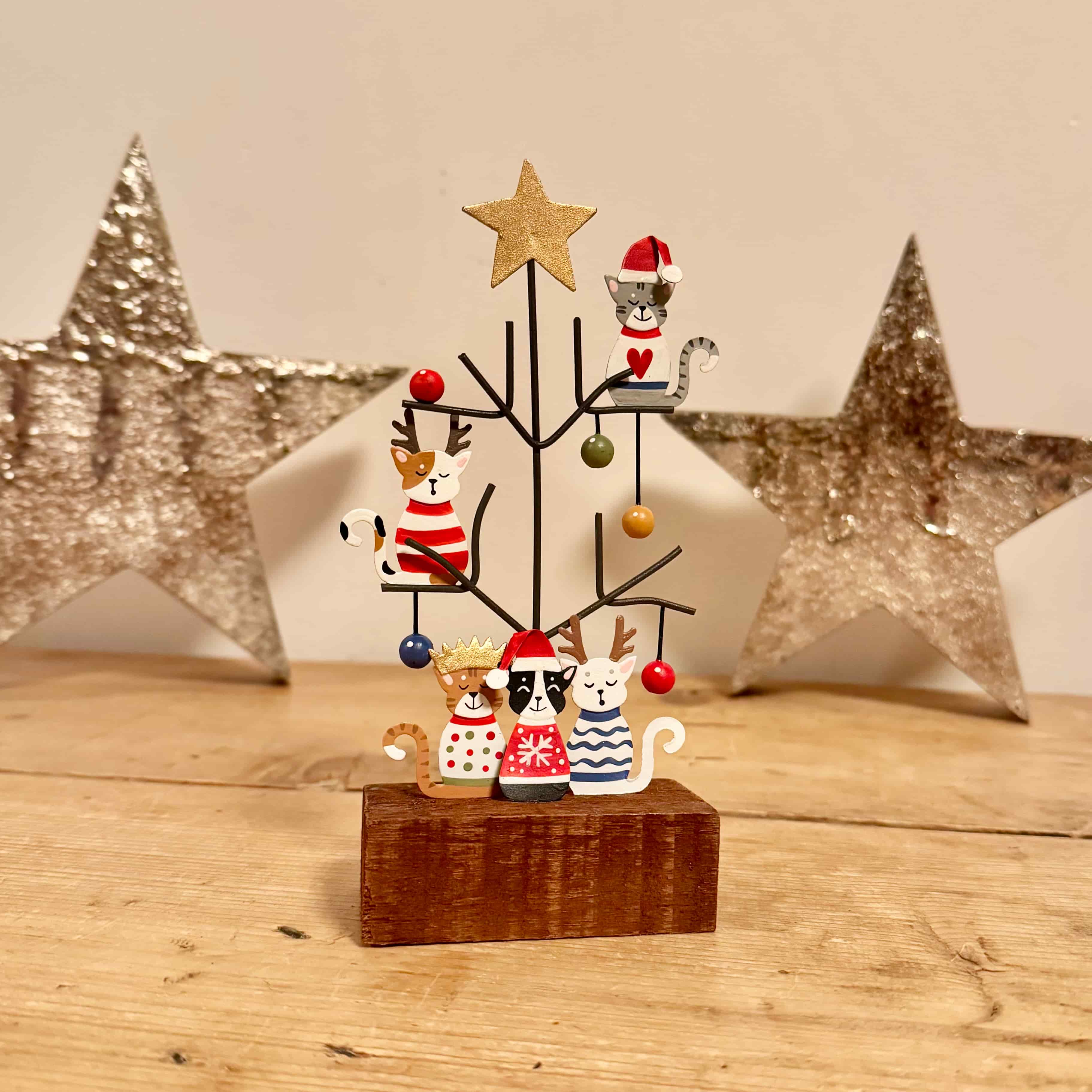 A fun, character-packed Christmas decoration featuring a troupe of mischievous cats climbing and perching on a festive tree. Bright baubles, tiny Santa hats and playful outfits give this piece loads of charm, perfect for adding a pop of colour to your Christmas décor. Ideal for shelves, sideboards and windowsills. A brilliant gift for cat lovers.
