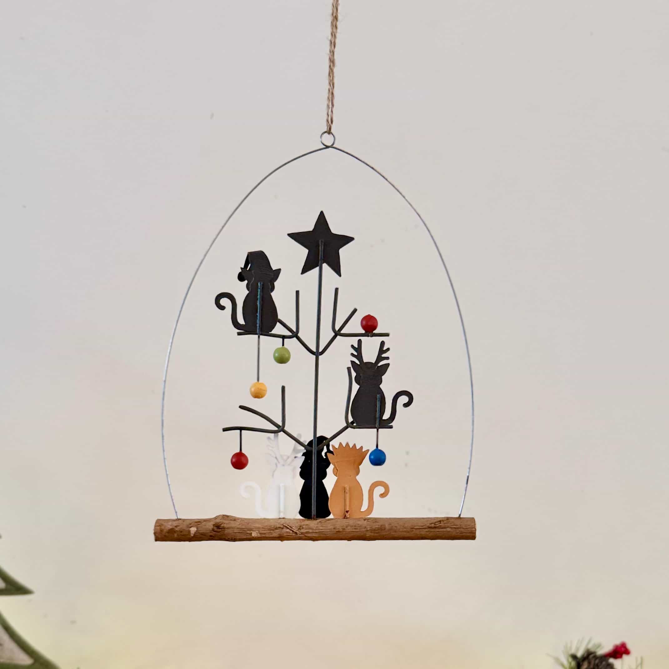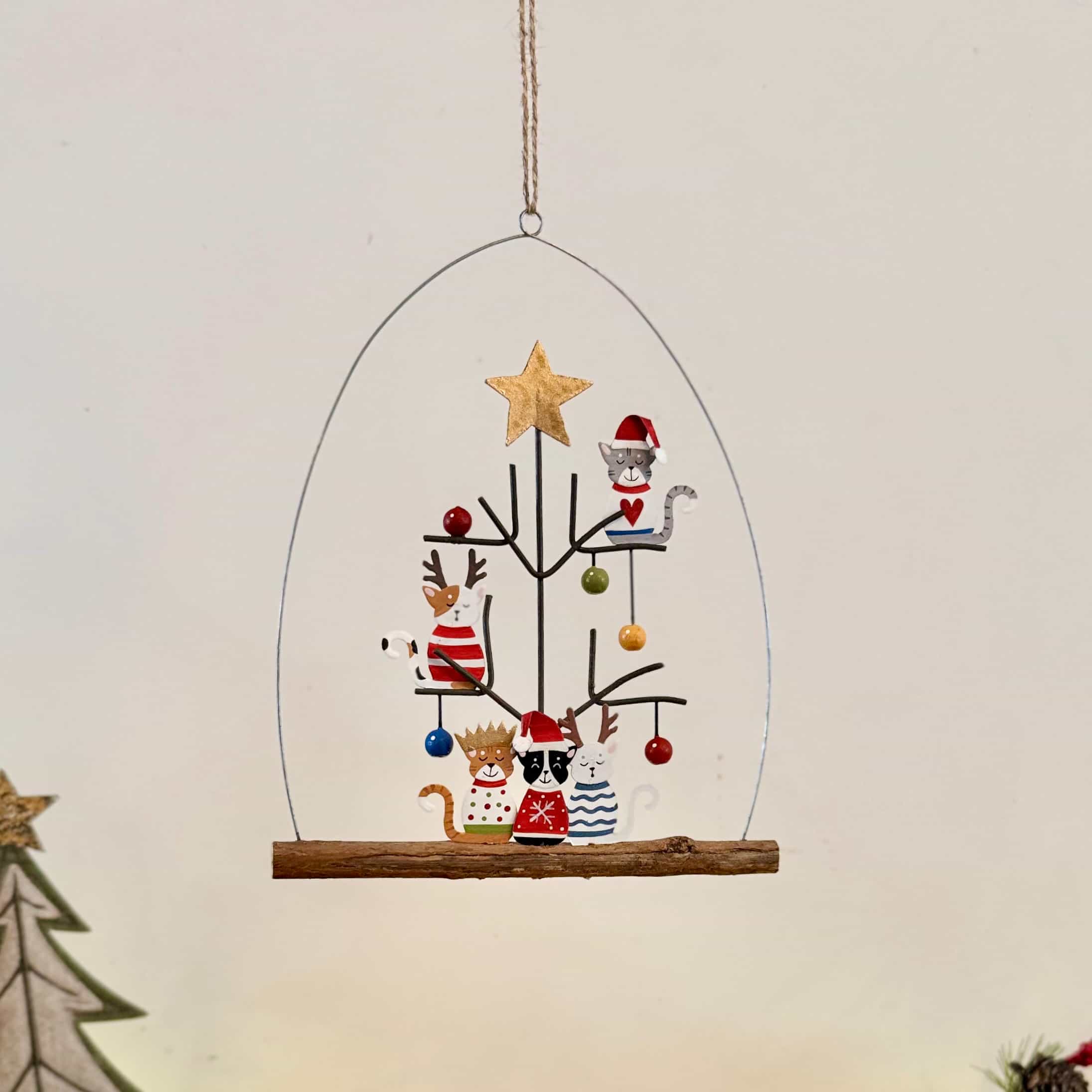 This playful hanging decoration features a festive gang of metal cats and dogs perched around a Christmas tree, complete with colourful baubles and a golden star on top. Finished on a rustic wooden perch and metal frame, it’s a charming mix of countryside craft and Christmas cheer.