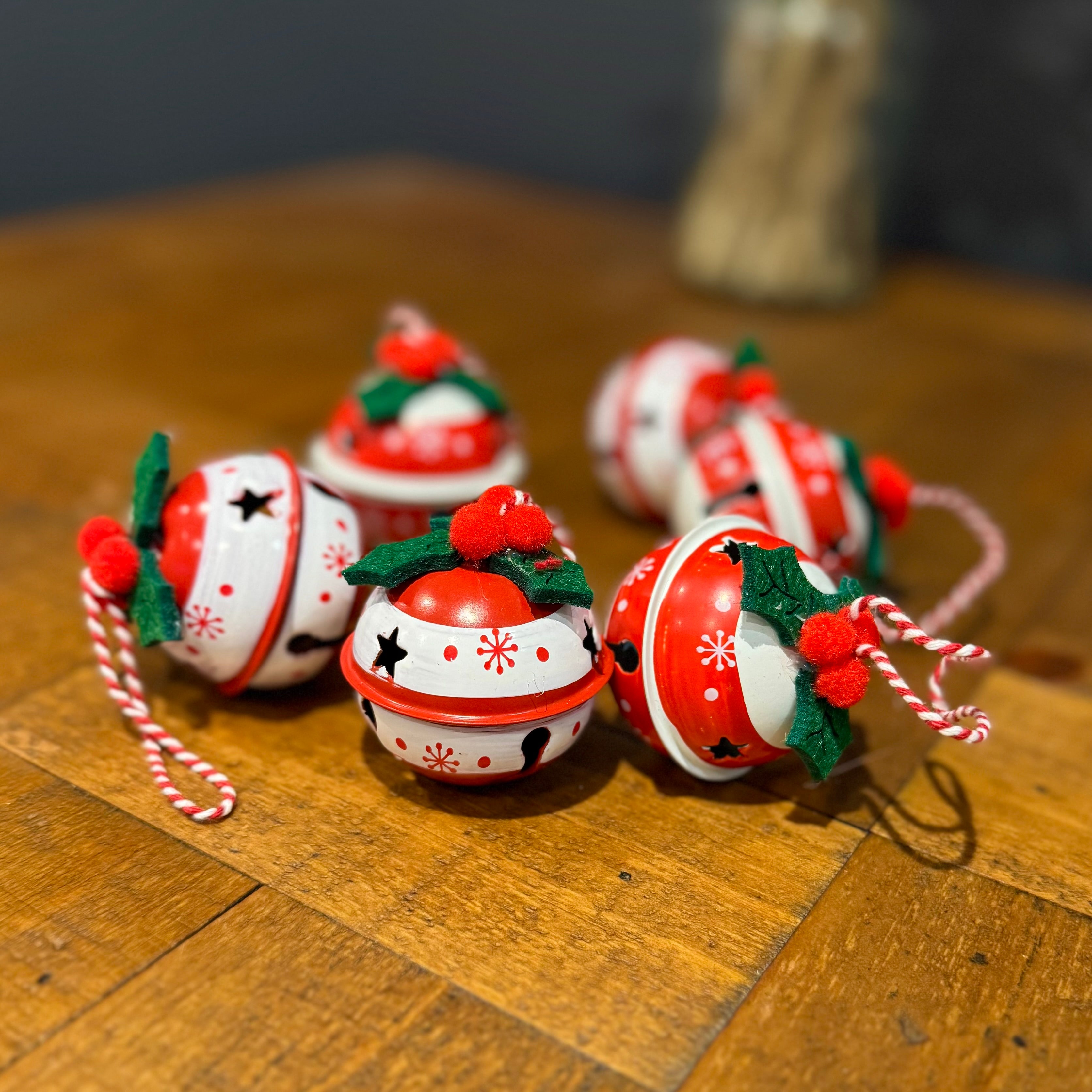 6 Red, White, Green Snowflake Patterned Bells