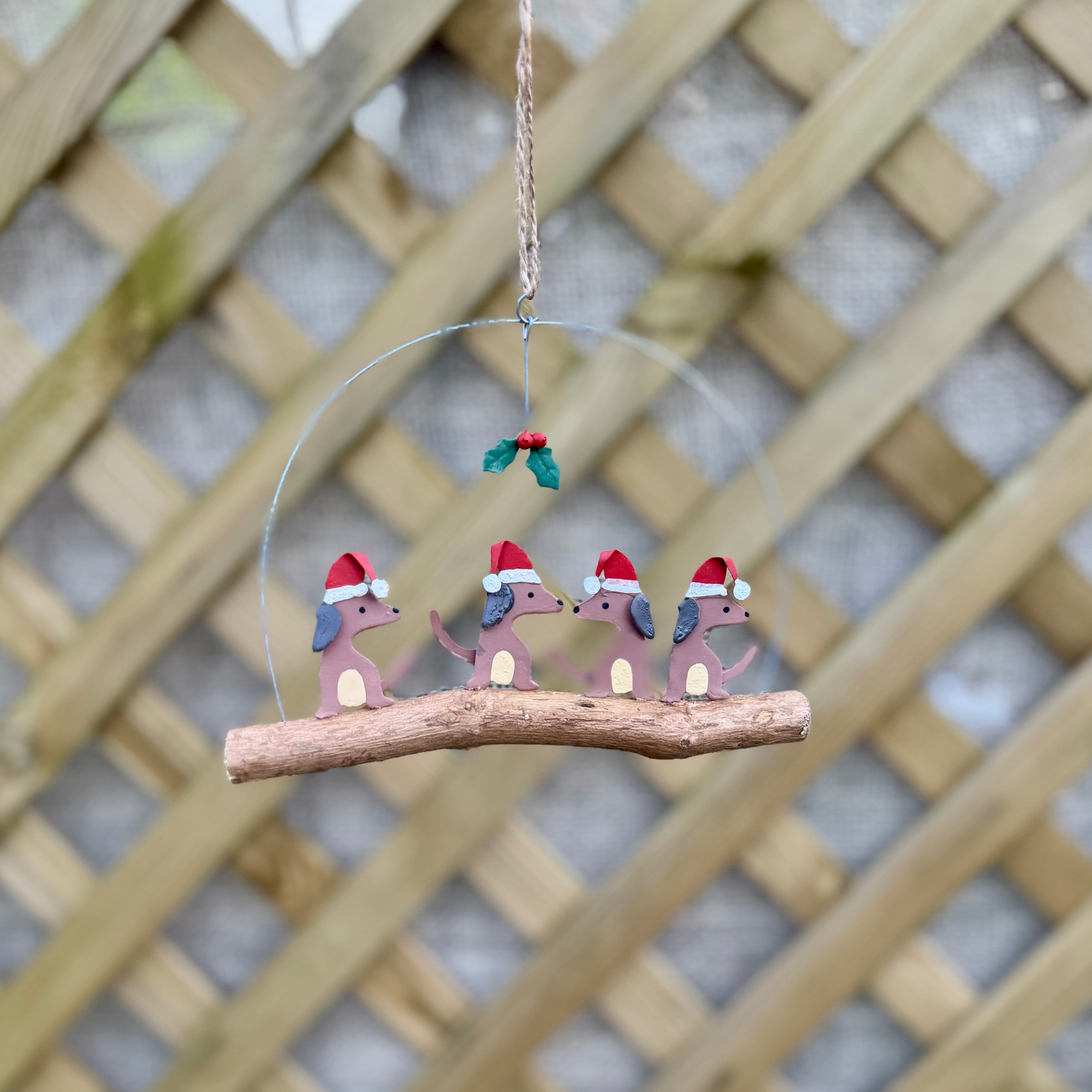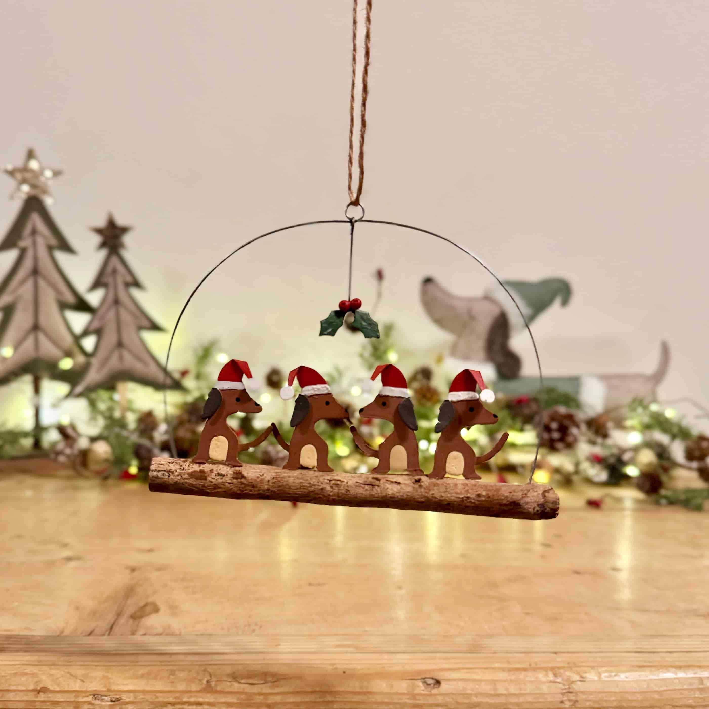 Add some festive cheer with this handmade metal dachshund Christmas decoration, featuring four adorable sausage dogs in Santa hats sitting beneath mistletoe. Each one is hand-painted with charming detail, bringing a warm, playful touch to your Christmas tree or festive display. A must-have for dog lovers and those who adore unique, character-filled Christmas décor.