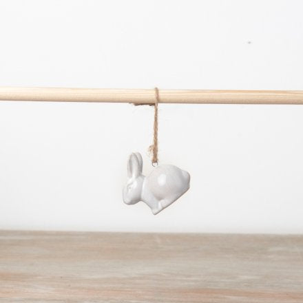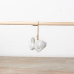 An on trend, chic ceramic bunny ornament with a natural reactive glaze. Complete with rustic jute string hanger.