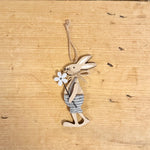 Adorable wooden rabbit cutout, with striped dungarees and a white felt flower.