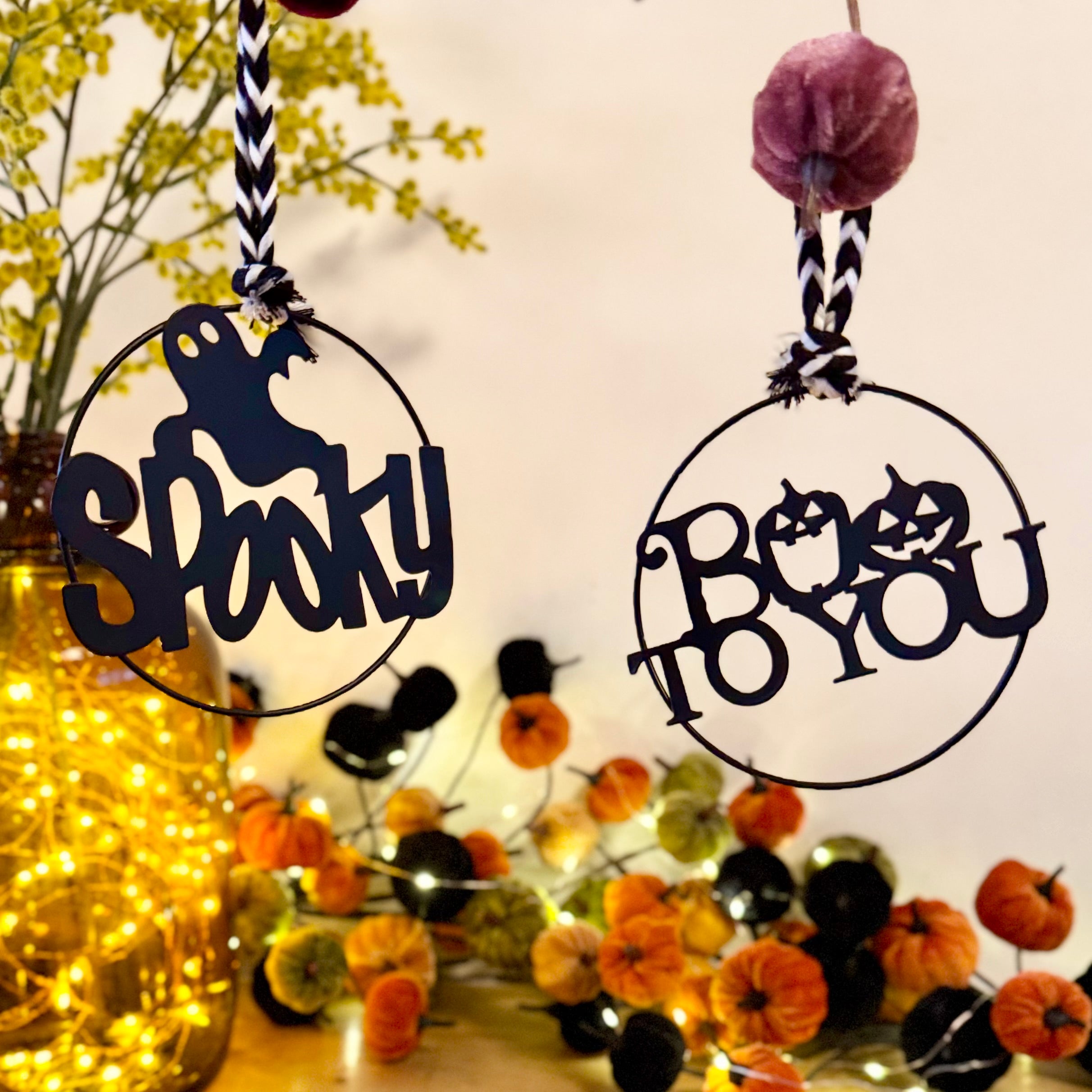 Set of two hanging Halloween hoop decorations — Spooky with a ghost and Boo to You with cheeky pumpkins. Both designs are cut from black metal silhouettes on slim steel hoops, finished with a plaited fabric loop for hanging. Easy to style on doors, shelves, garlands or autumn branches, they bring bold Halloween character to your home without the fuss.