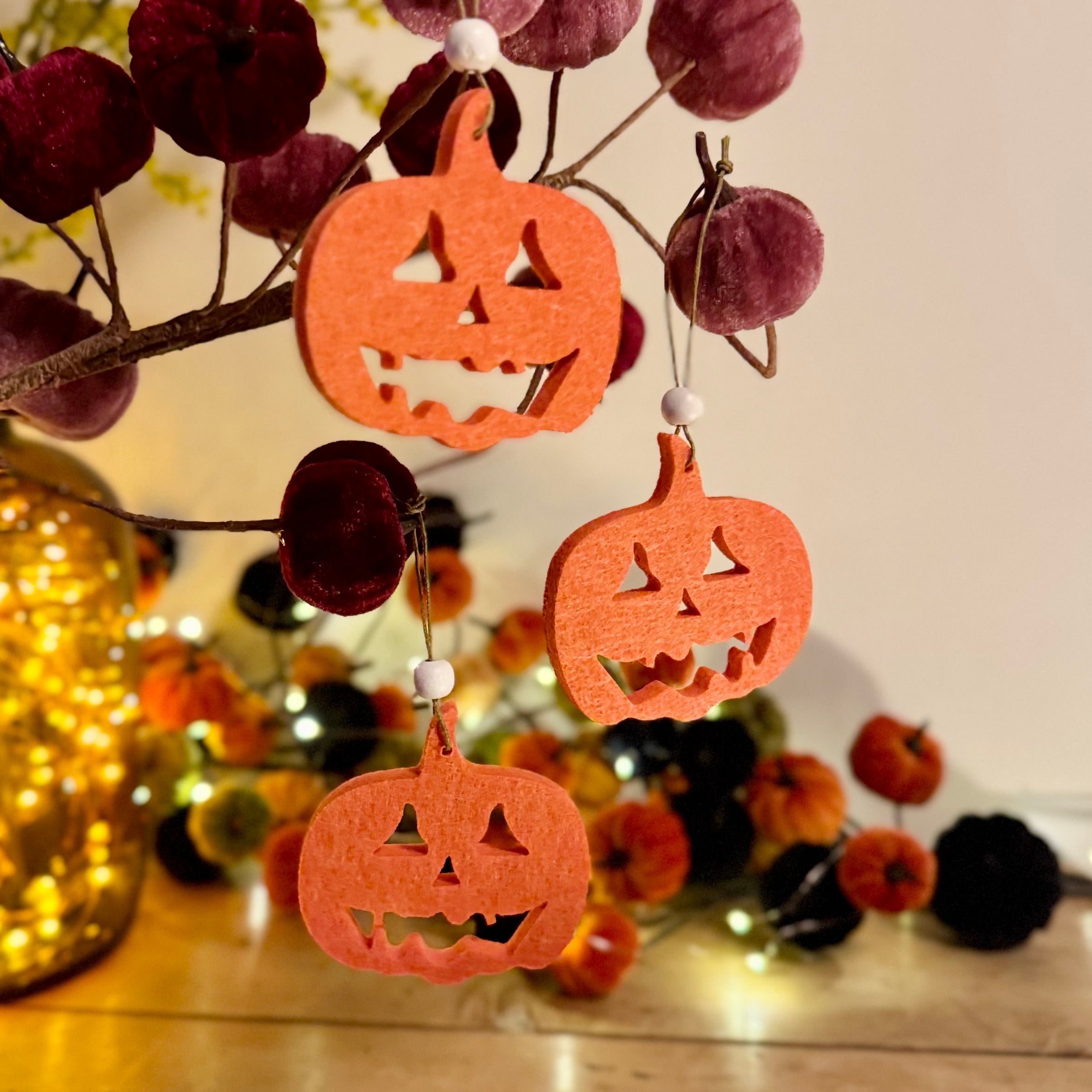 Brighten your Halloween styling with this playful set of three hanging pumpkin decorations. Crafted from soft orange felt with cheerful cut-out jack-o’-lantern faces, each piece is finished with a simple bead and string hanger. Lightweight and versatile, they’re perfect for hanging on twig trees, door handles or mixing into a garland for an instant pop of seasonal fun. A great way to add a splash of Halloween character to your home décor.