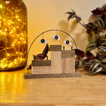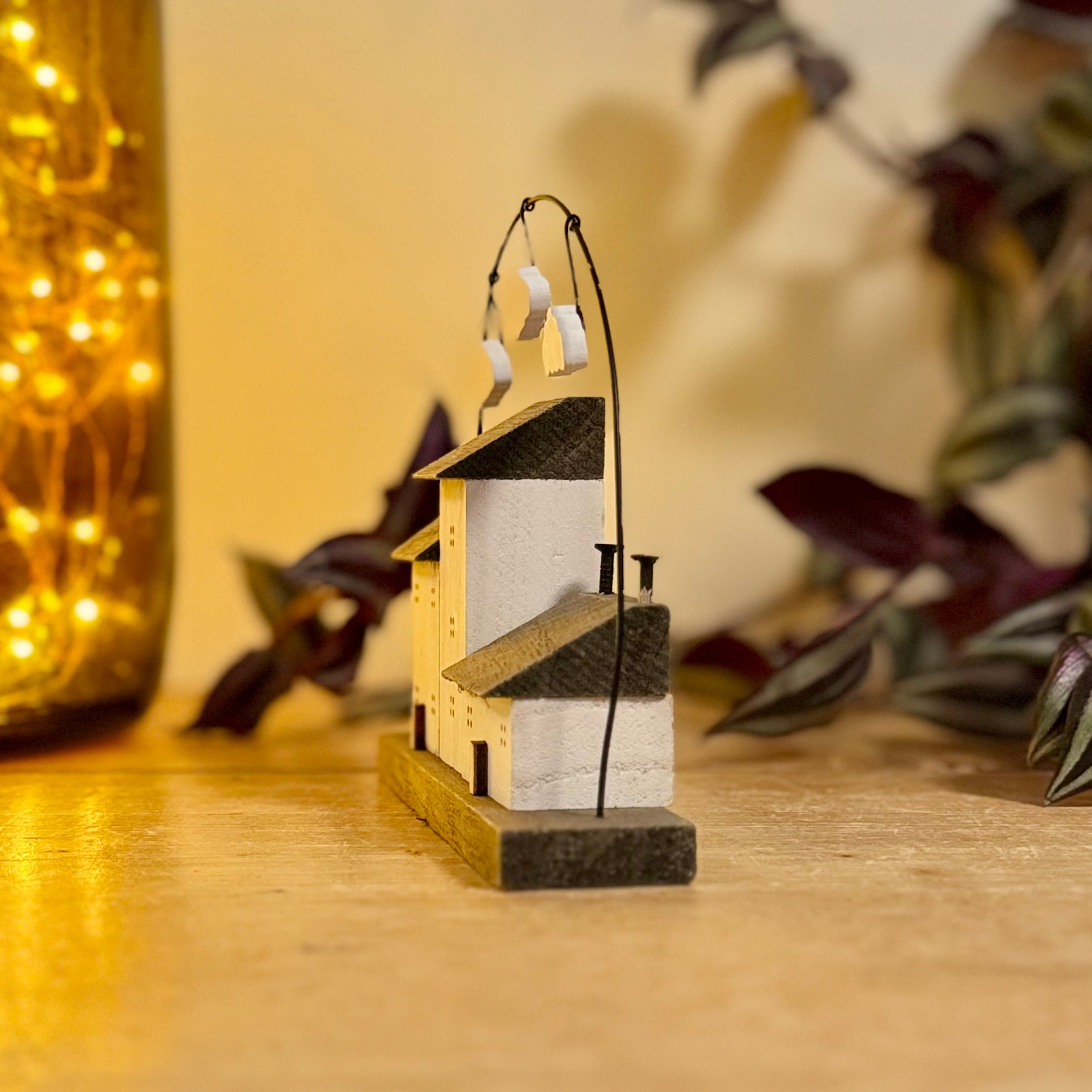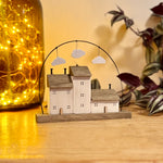 Rustic wooden houses decoration with floating cloud detail, set on a driftwood-style base. This handmade village ornament is perfect for cottage décor, rustic home styling and unique wooden accessories, bringing charm and character to a shelf, sideboard or display.