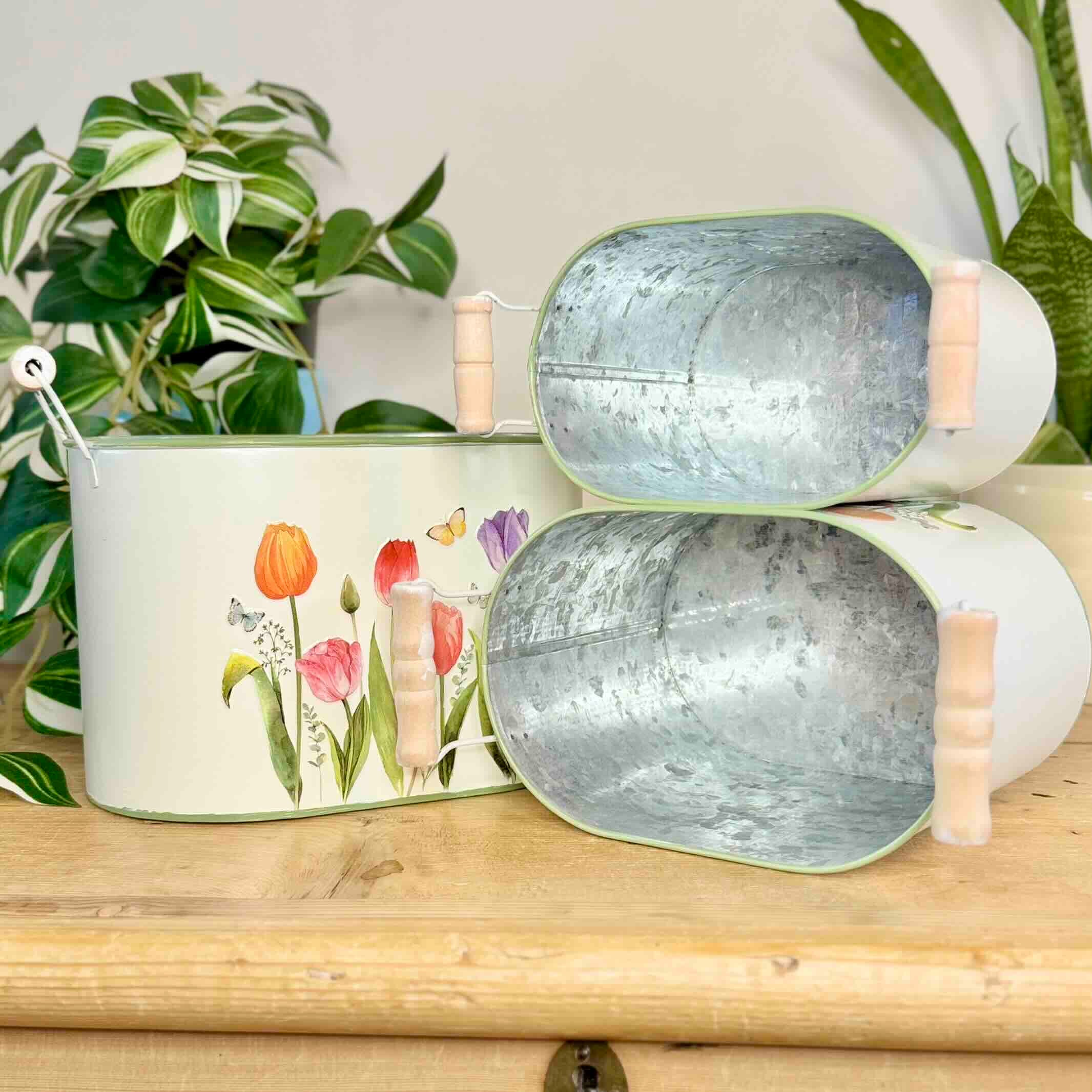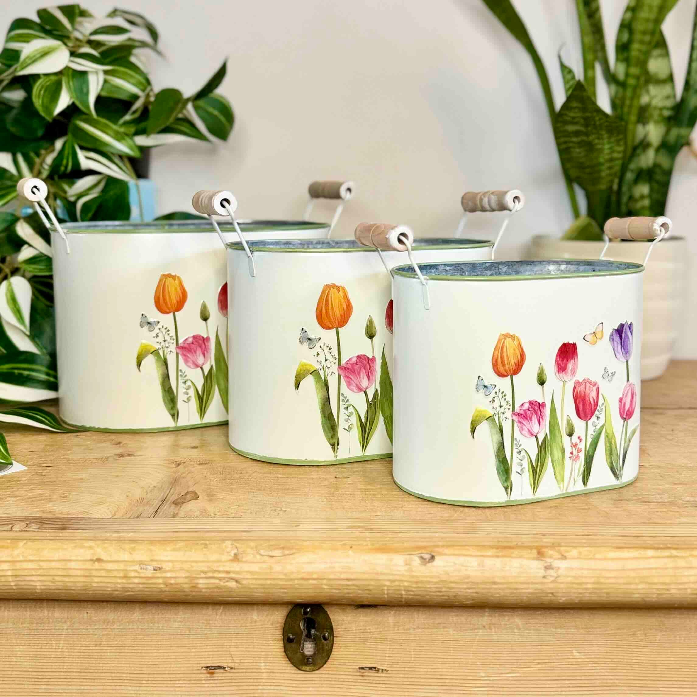 A cheerful set of three metal trough planters decorated with colourful tulip designs, perfect for bringing a fresh botanical feel to shelves, windowsills or garden tables. The painted metal finish and classic bucket-style shape make them ideal for displaying small house plants, herbs or faux stems, adding height and colour to spring styling. Designed to work beautifully together or separately, these decorative metal plant pots add rustic charm and floral character to kitchens, conservatories and indoor plant displays.