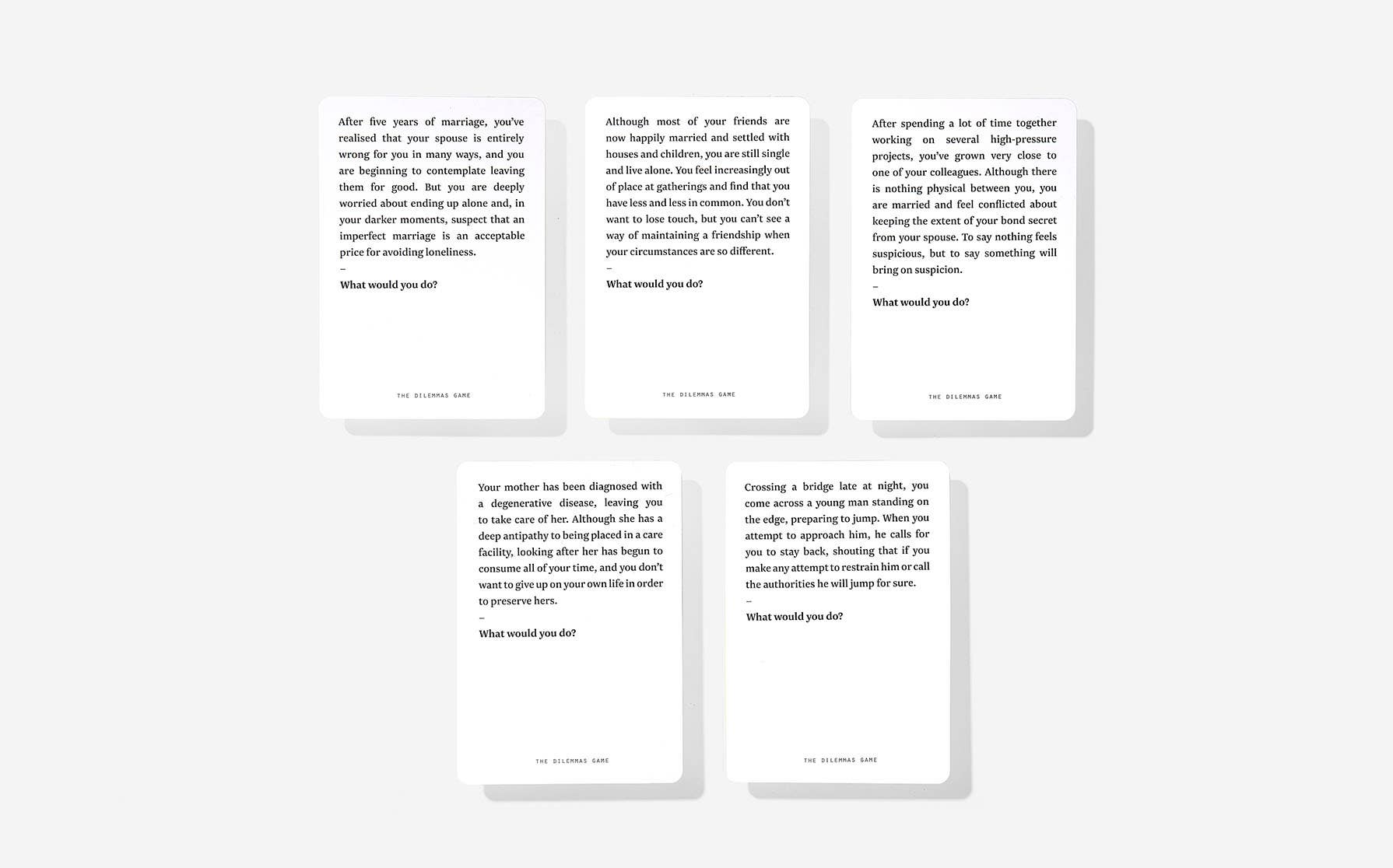 The Dilemmas Game is an entertaining and thought-provoking experience that allows you to showcase your moral reasoning skills. With 52 common dilemmas to tackle, you'll have countless opportunities to propose unique solutions and engage in lively discussions with your friends and family. By drawing on analogies or real-life experiences, you'll gain valuable insights while enjoying quality time together. This game is not only fun but also a practical way to prepare for the inevitable quandaries that life throws at us. *for adults only