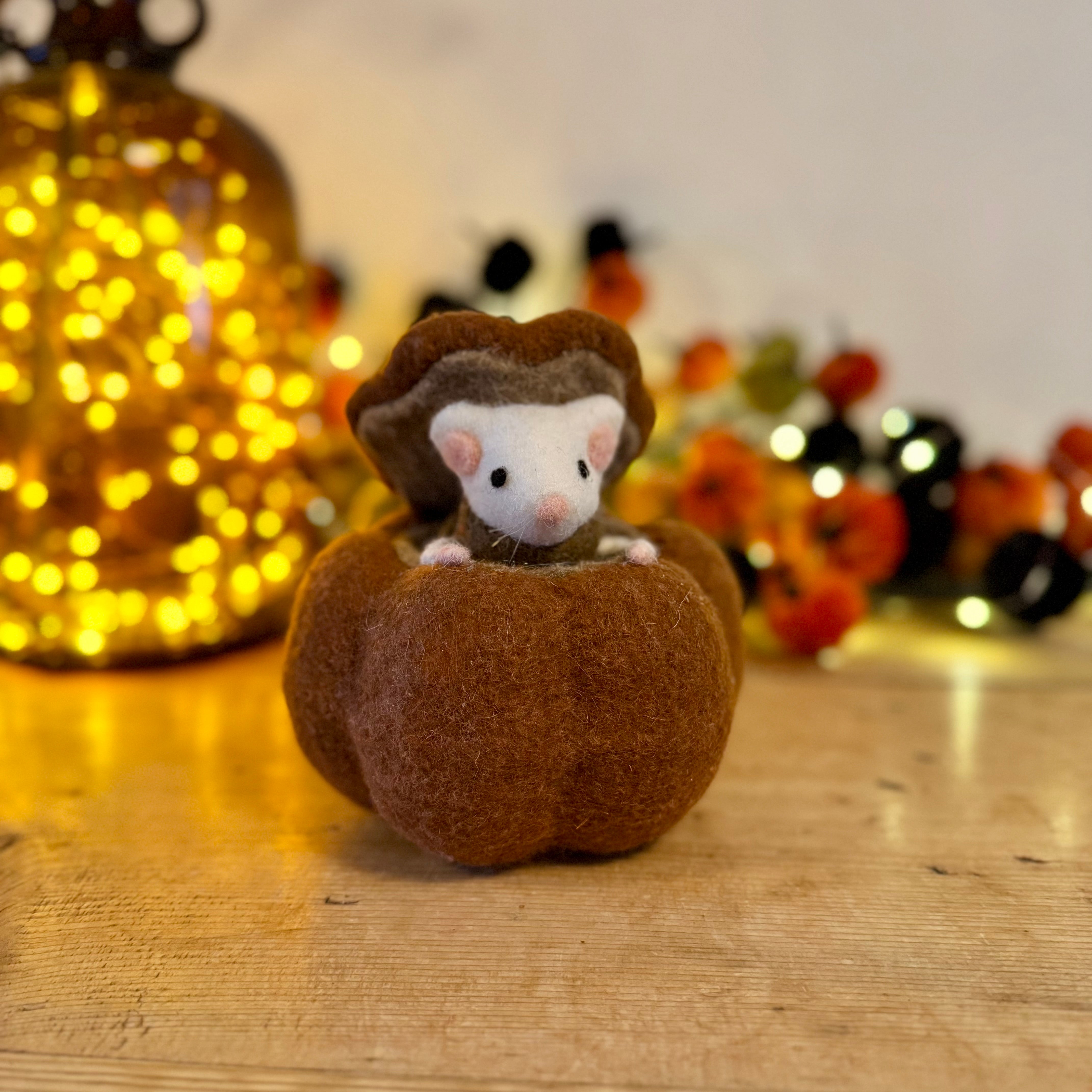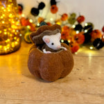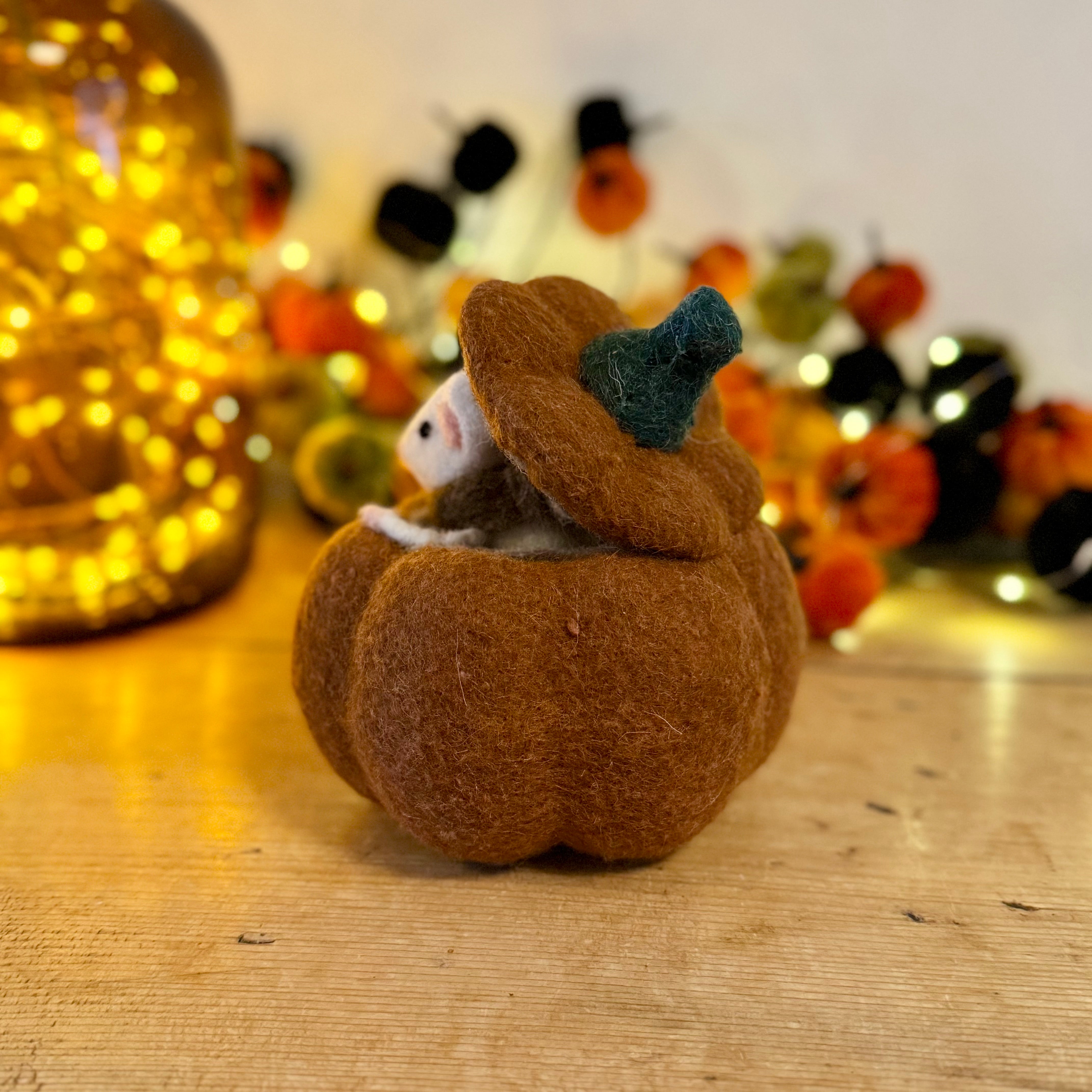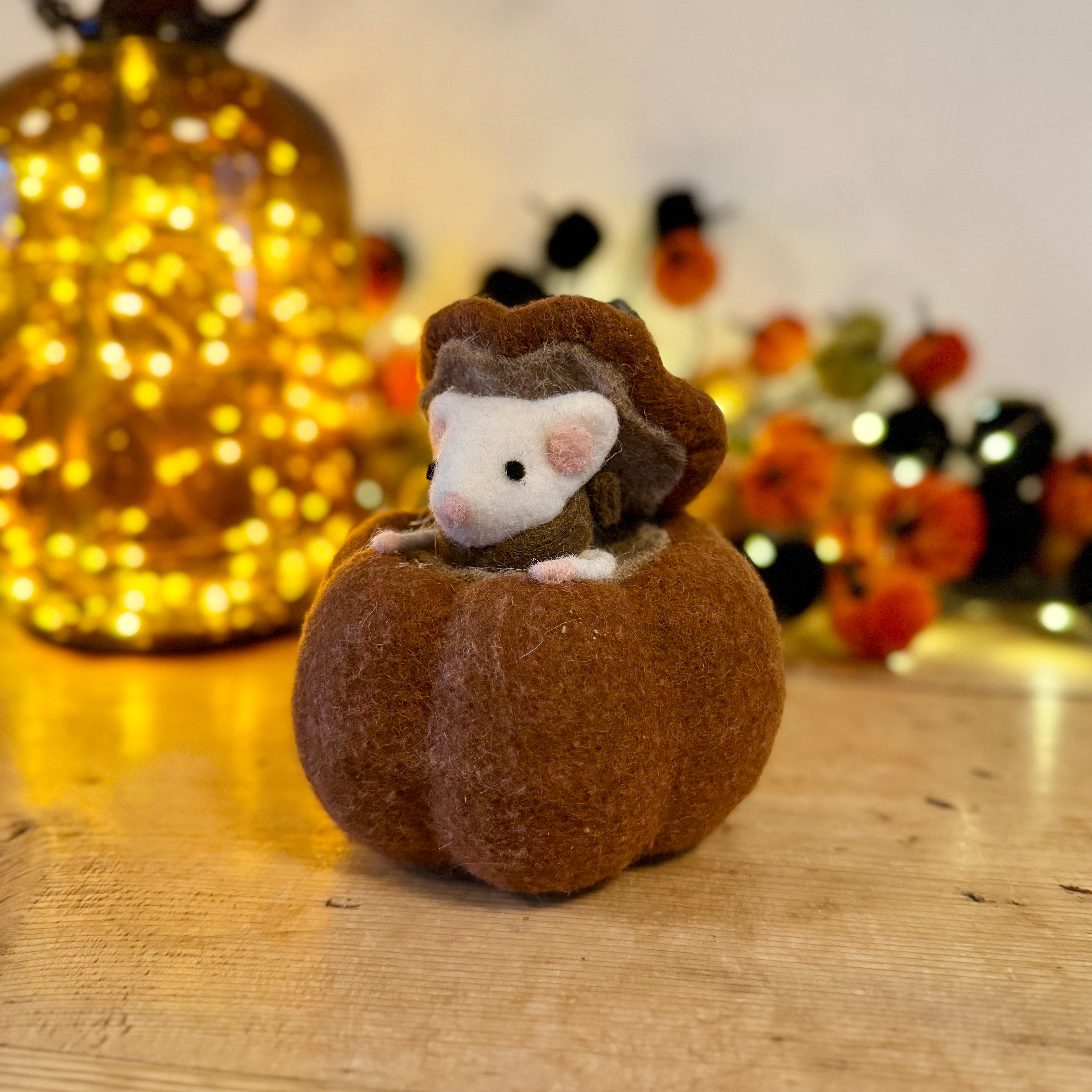 Large handmade felt mouse decoration nestled inside a cosy felt pumpkin, full of natural autumn tones. Bursting with woodland charm, it’s perfect for autumn décor, Halloween displays, or as a unique gift for lovers of handcrafted pieces. A delightful seasonal accent that adds rustic character to shelves, mantels, or table styling year after year.