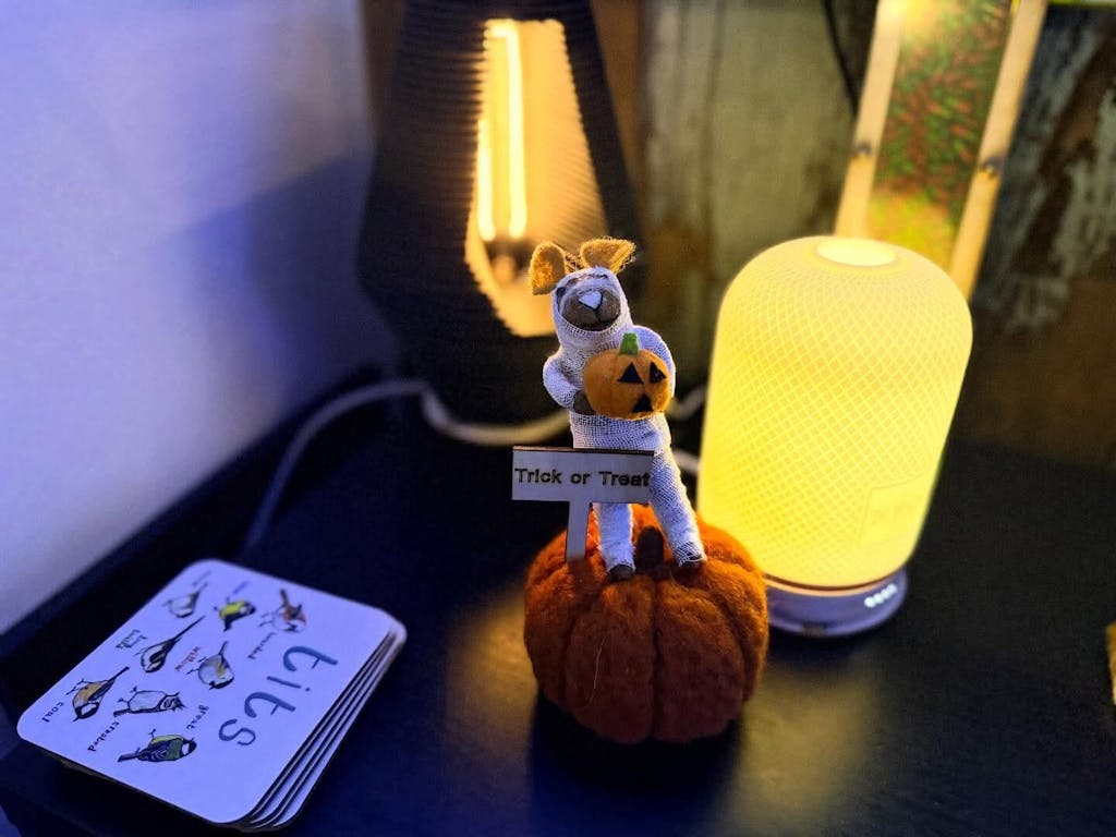 All wrapped up and ready for mischief, this felted mummy mouse stands on a plump autumn pumpkin, holding a tiny jack-o’-lantern pumpkin. Complete with a wooden “Trick or Treat” sign, it’s a playful blend of autumn charm and Halloween spirit. A quirky, handmade decoration that works perfectly on shelves, sideboards or seasonal displays, bringing character to your autumn home décor and Halloween styling.