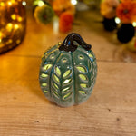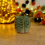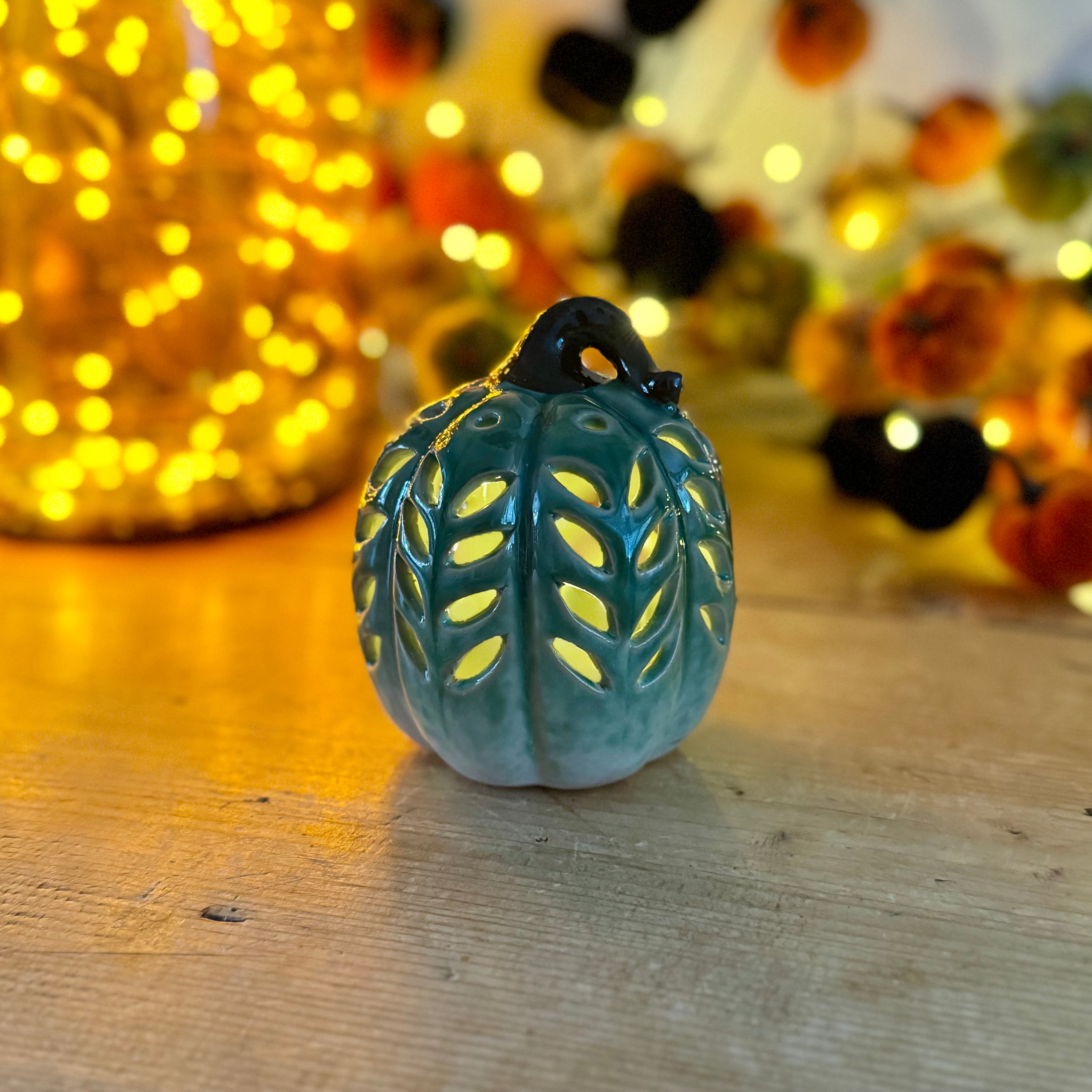 Ceramic pumpkin lantern with a soft green glaze and cut-out leaf design, complete with a fitted LED light inside. Perfect for autumn décor, cosy evenings, or adding a warm glow to Halloween displays. A timeless seasonal accent that brings rustic charm and atmospheric light to shelves, tables, and mantels.