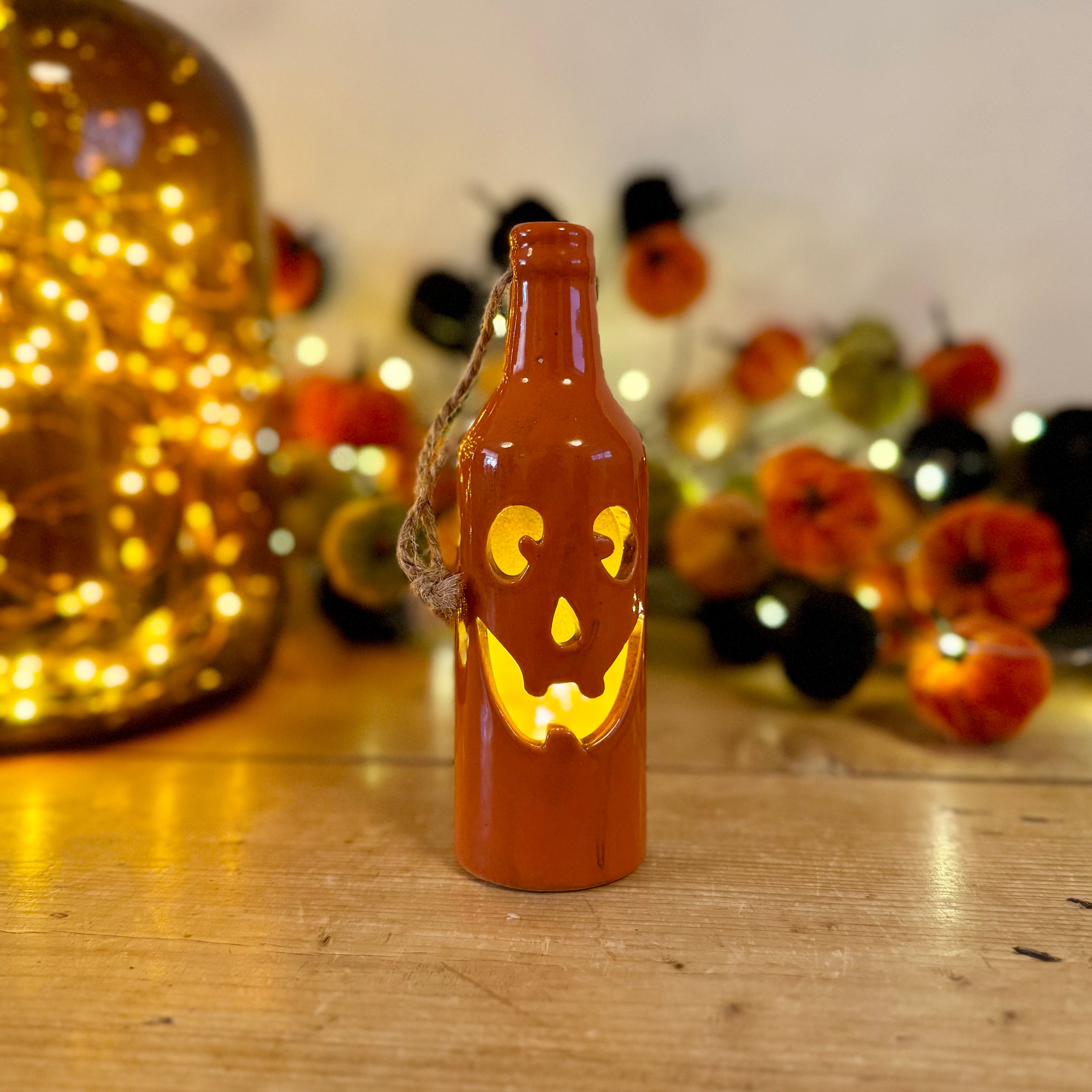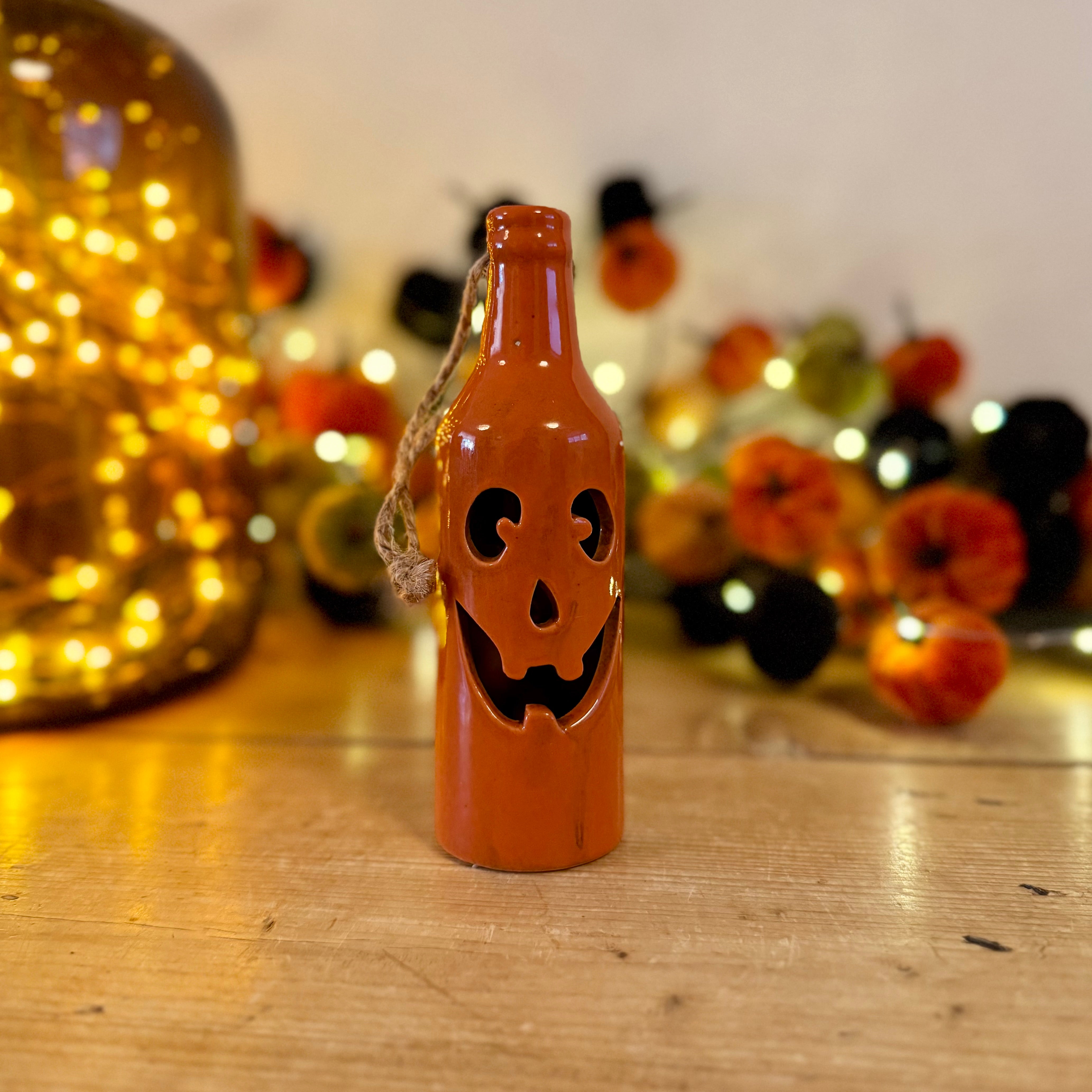 Ceramic Halloween bottle lantern with a carved jack-o’-lantern face and warm LED light inside. Finished in glossy pumpkin orange and complete with a rustic jute loop for hanging, it’s perfect for styling on windows, walls, or shelves. A unique piece of Halloween décor that brings spooky charm and a cosy autumn glow to your home.