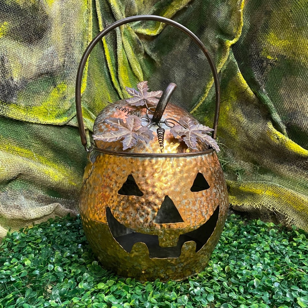 This medium copper effect pumpkin lantern is ideal as a statement piece for the garden or in your home. Complete with solid metal handle and lid with intricate leaf and vine details, the metal features a rustic hammered finish with coppery tones. Add your favourite candle, or maybe a battery light and watch this lantern come to life!
