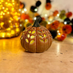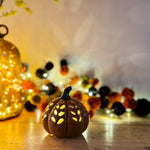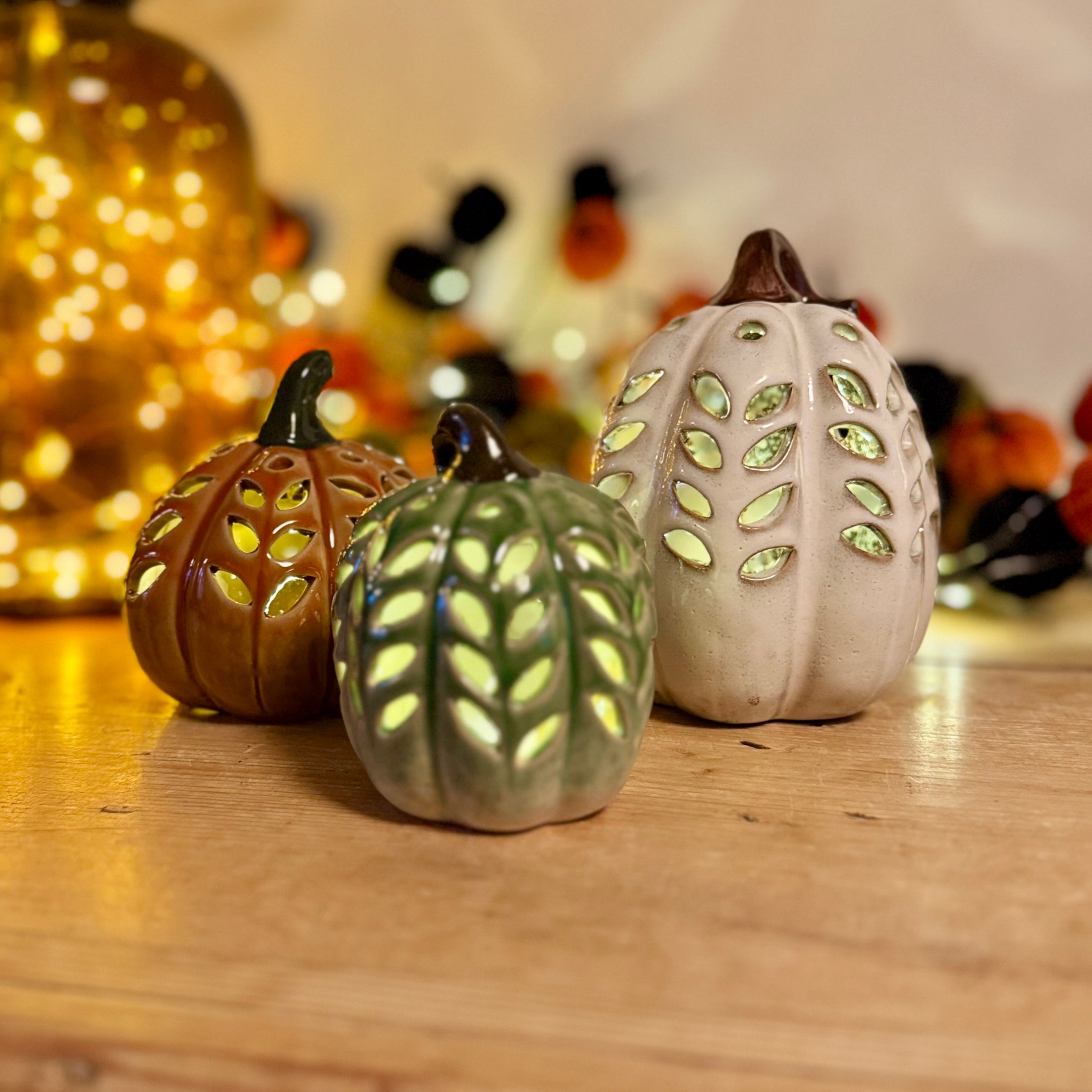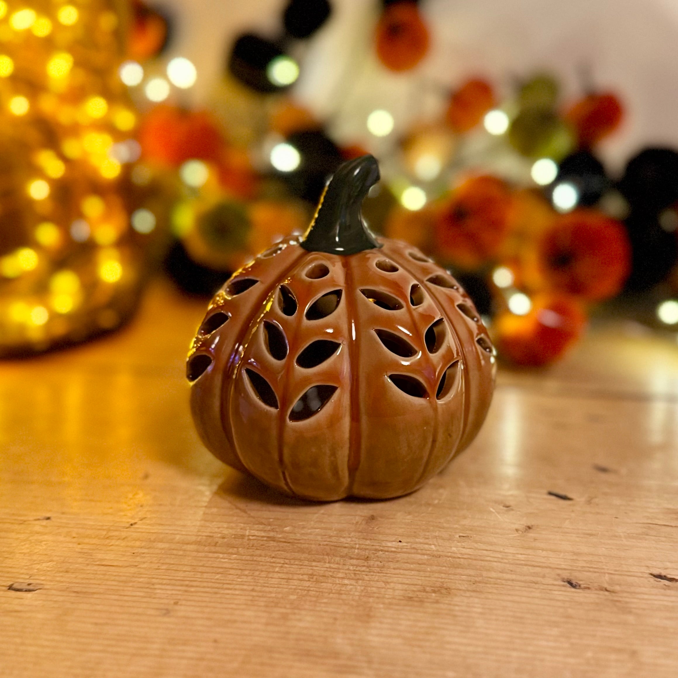 Warm and inviting, this ceramic pumpkin lantern casts a cosy autumn glow through its cut-out leaf design. Finished in a rich orange glaze with a glossy green stem, it’s perfect for styling on shelves, windowsills or sideboards to bring seasonal atmosphere to your home. The built-in LED light creates playful patterns in the evening, making it an ideal piece for both autumn home décor and Halloween displays.
