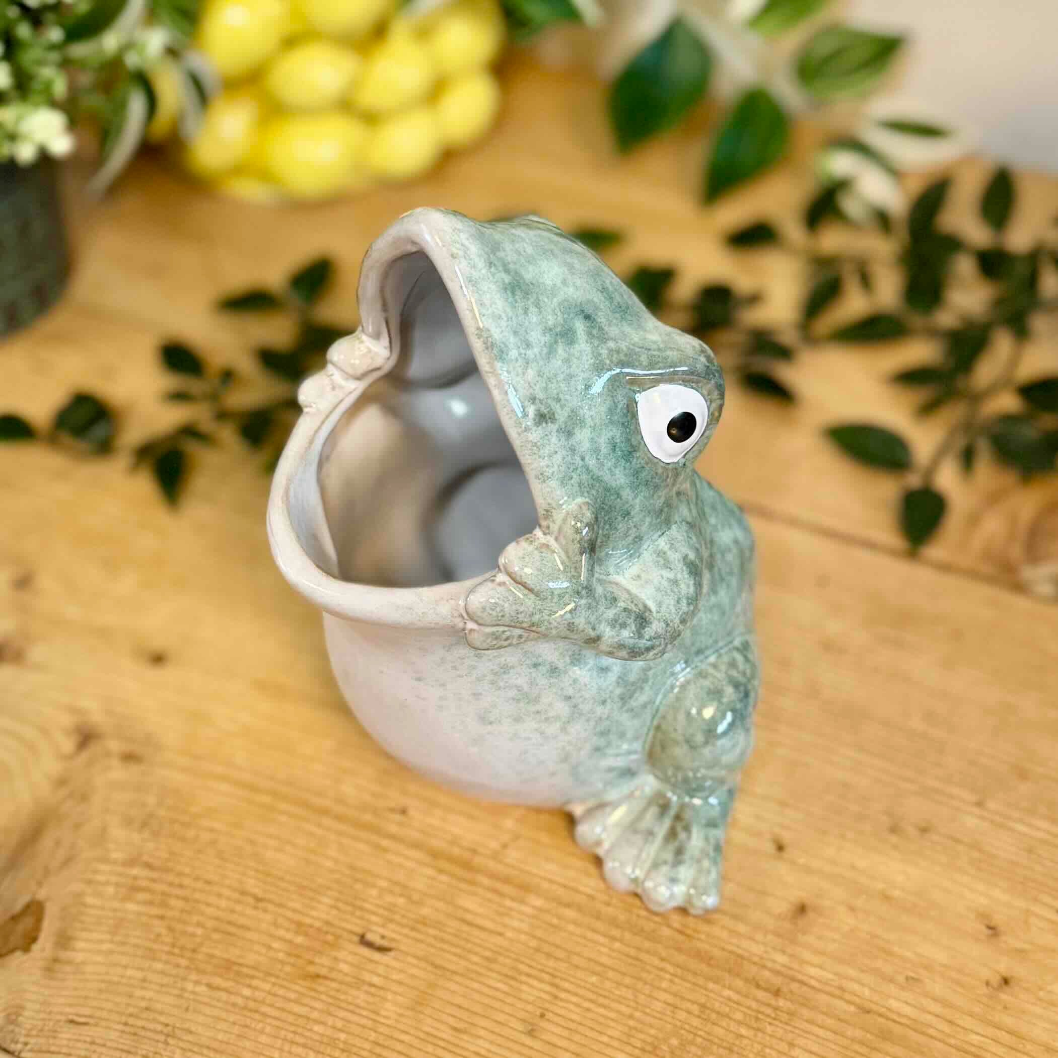 • Features: Frog-shaped planter design, glazed ceramic surface, open-top plant pot
