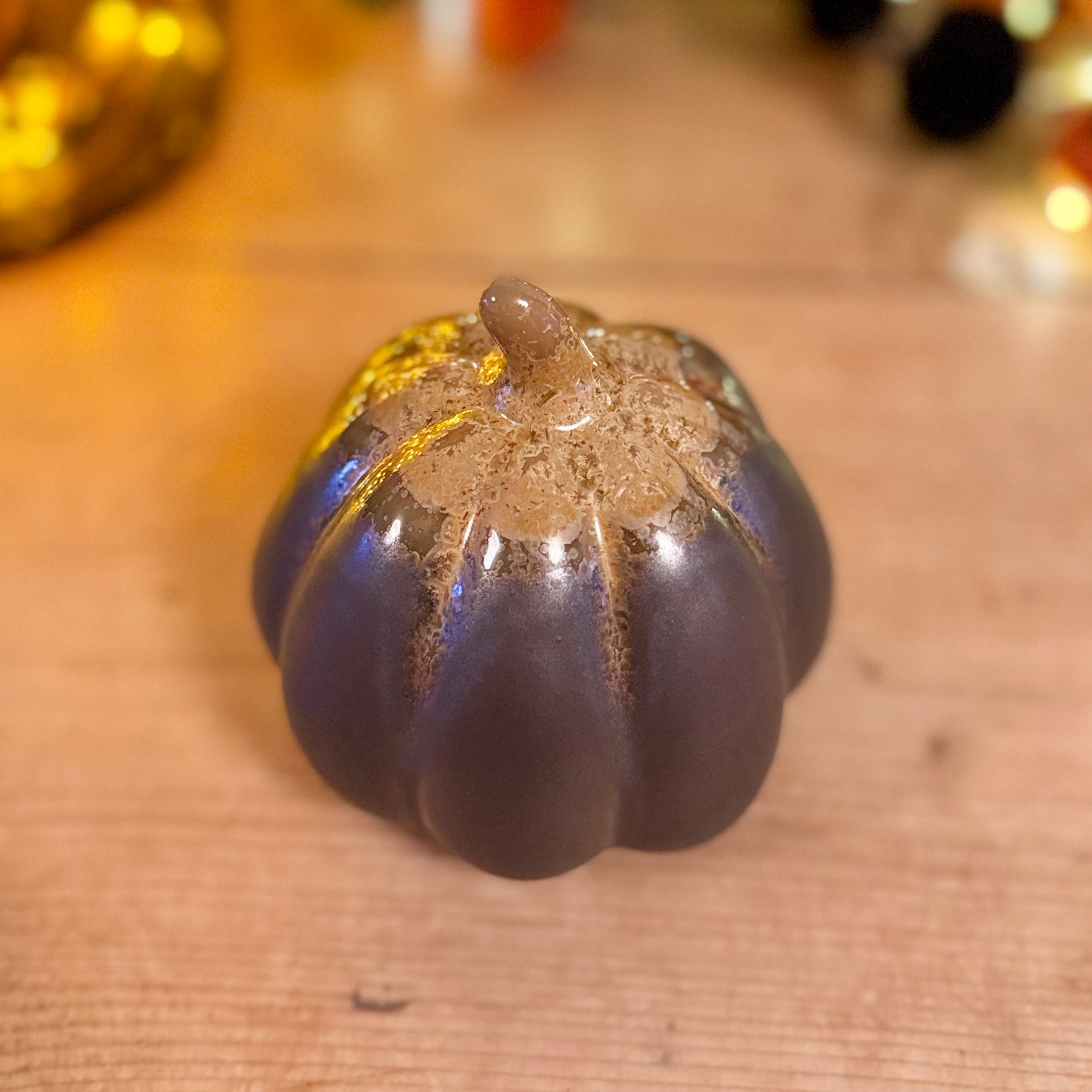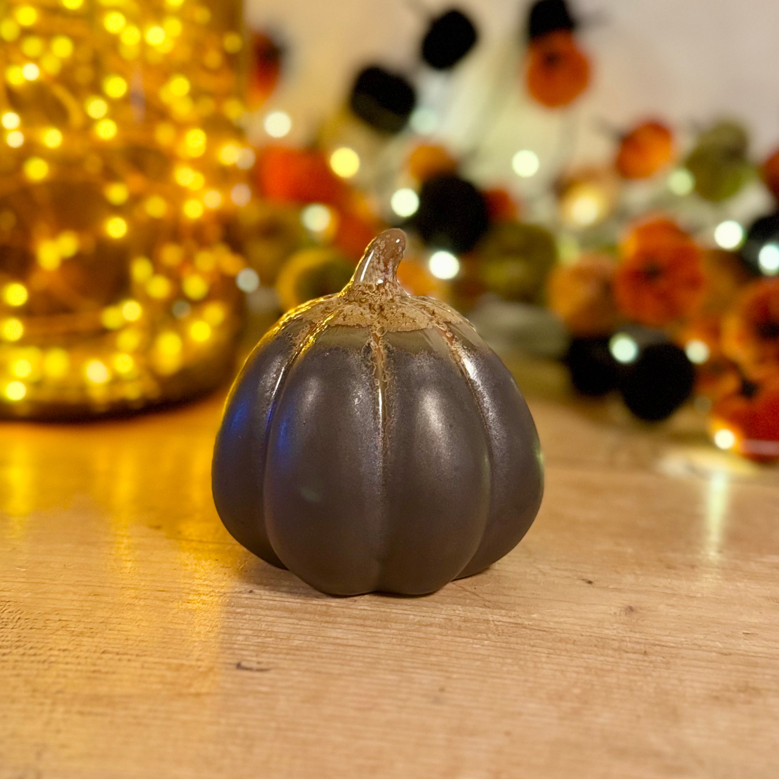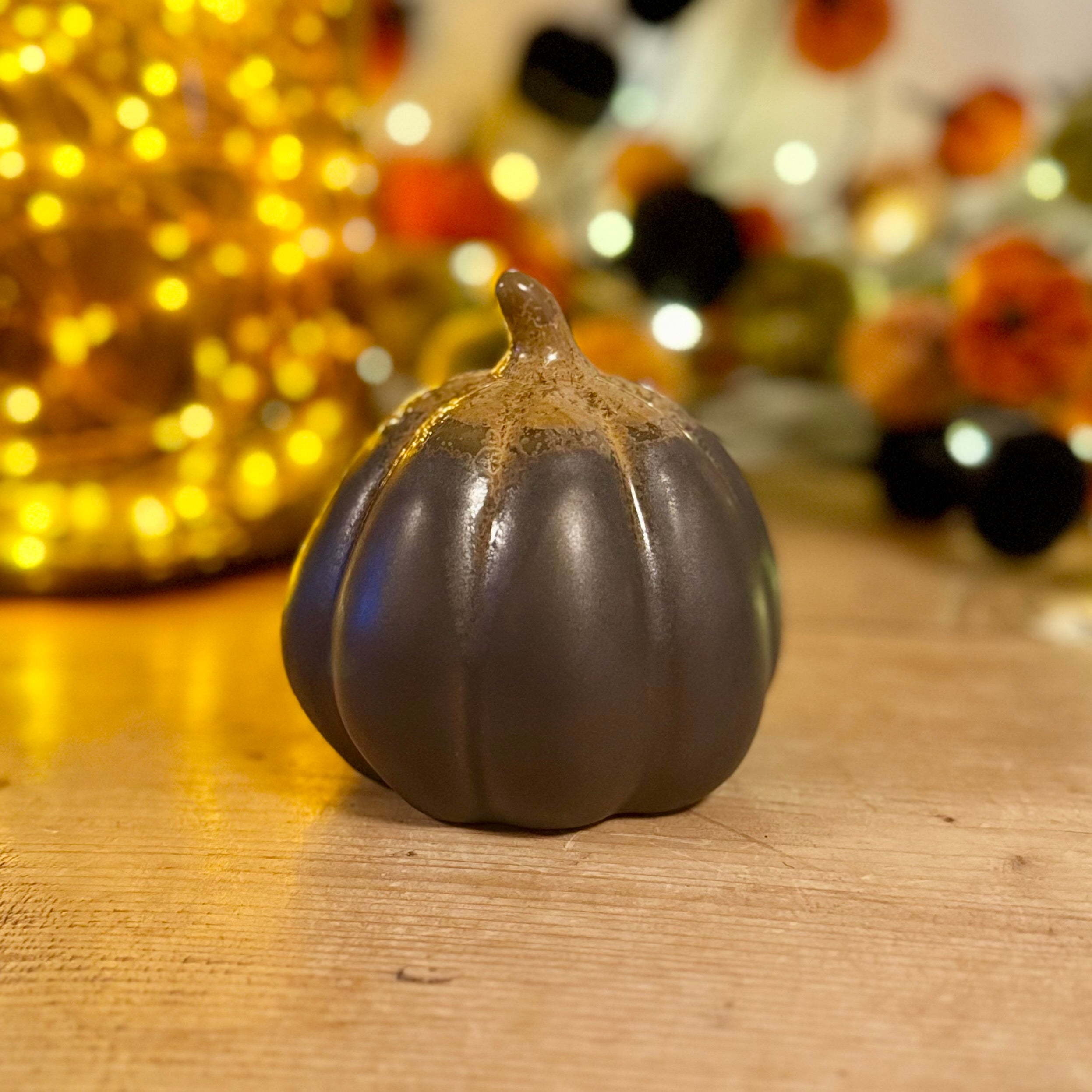Give your autumn décor a bold edge with this ceramic pumpkin in deep matte grey, finished with a mottled gold stem. Its sleek, modern look makes it perfect for styling on shelves, sideboards or as part of a seasonal table display. A striking piece that blends rustic autumn charm with a touch of luxe – ideal for both everyday autumn décor and Halloween styling.