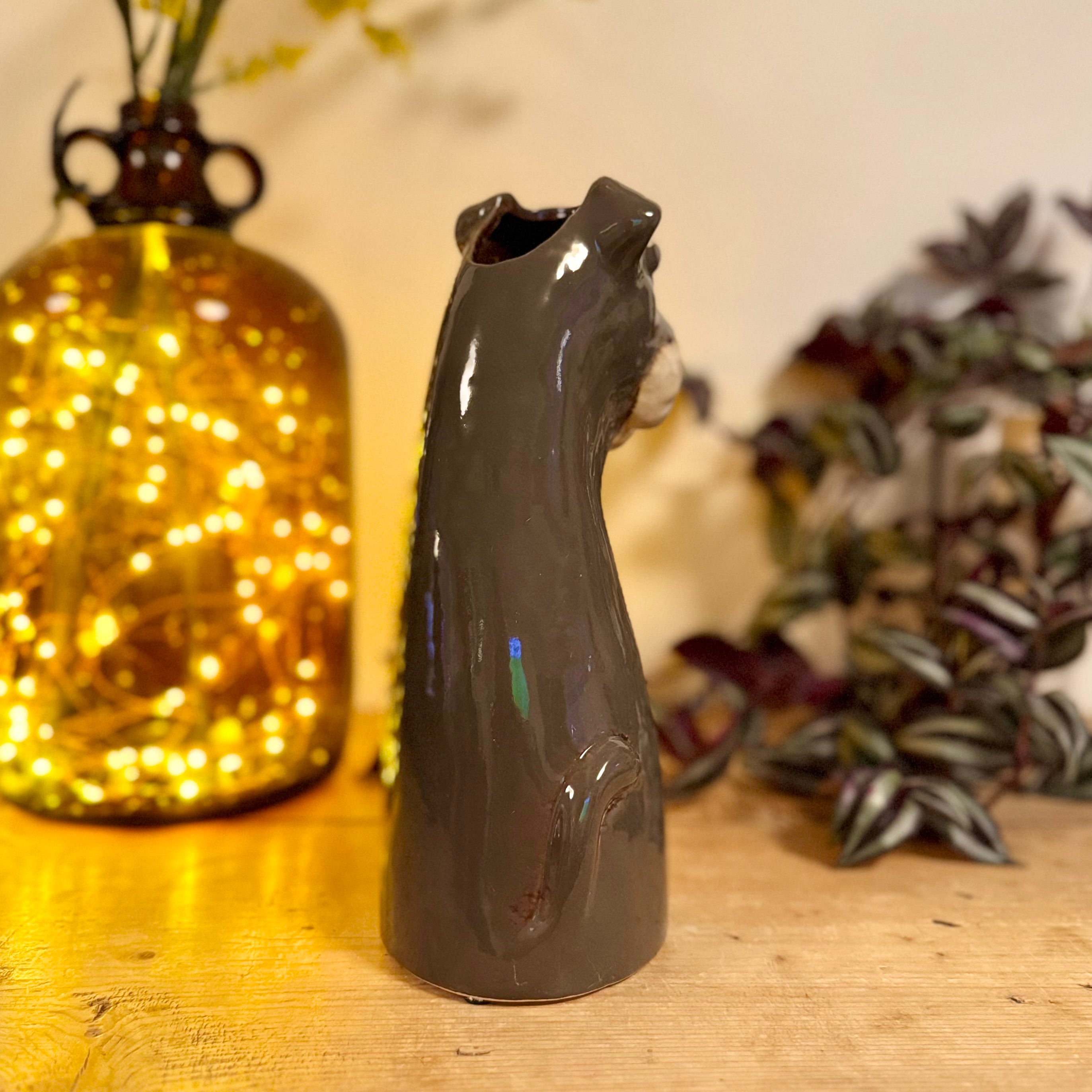 Hand-painted ceramic schnauzer vase with heaps of personality. A striking dog ornament that doubles as a quirky flower vase, perfect for animal lovers and those who adore unique home décor. Ideal for rustic interiors, pet-themed gifts and collectors of statement ceramics.