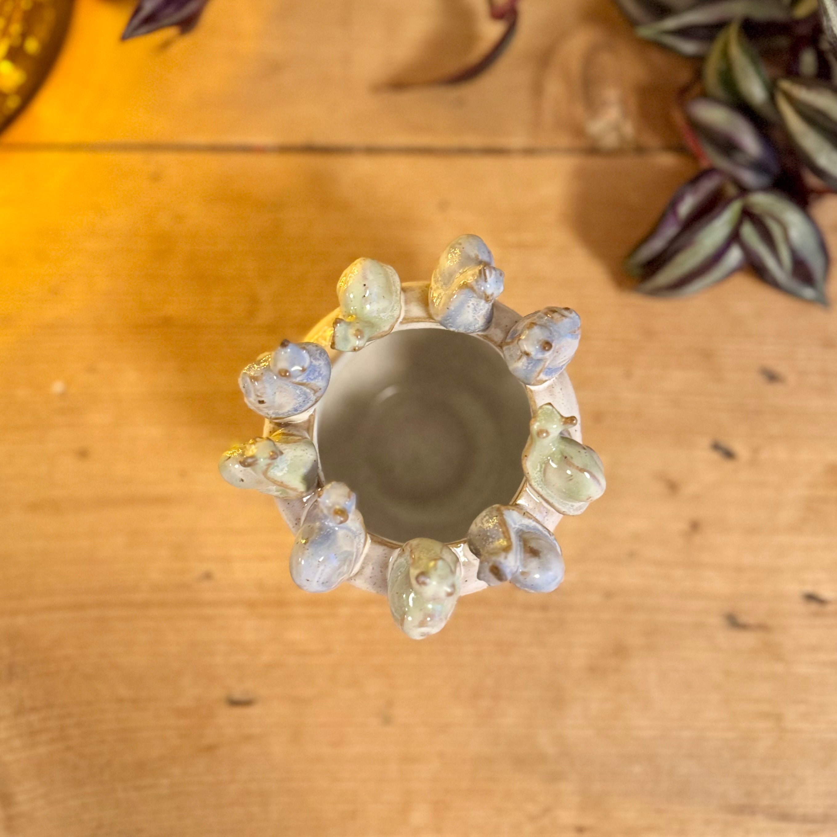 This ceramic snail pot is a true one-of-a-kind statement piece, with a ring of hand-finished snails perched playfully around the rim. The glossy blue and green glazes pop against the neutral base, making it a striking plant pot, storage pot or decorative accent for a shelf, sideboard or table. Perfect for lovers of unusual ceramics and quirky home décor. Each piece may feature unique variations that add to its character.