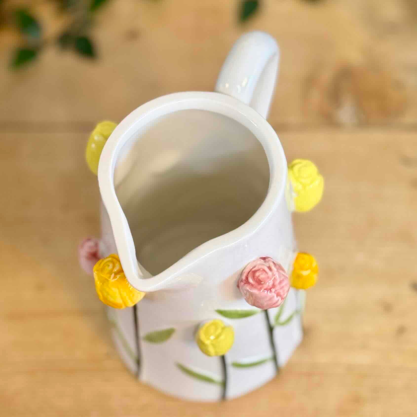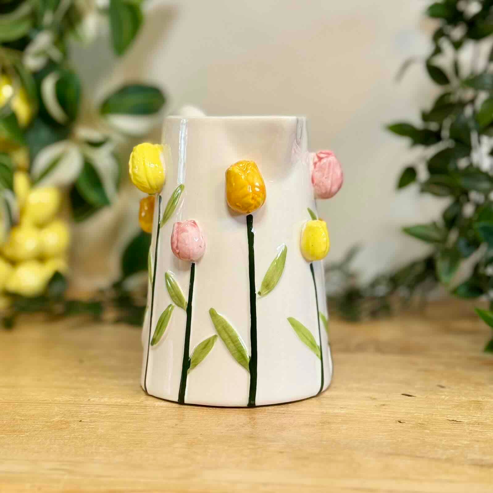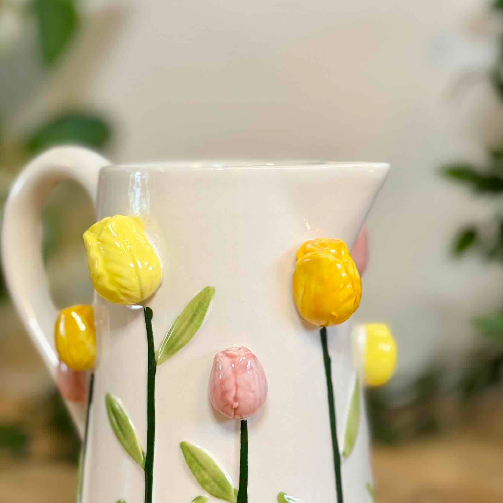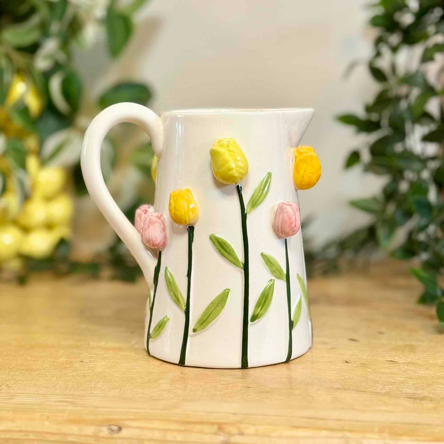 Bring a touch of spring home décor to shelves, tables or sideboards with this ceramic tulip jug, finished with soft raised flowers in pastel pinks, yellows and warm seasonal tones. The sculpted tulip stems add texture and interest, making it just as eye-catching styled empty as it is filled with faux stems or fresh blooms. A lovely piece for everyday home décor, Easter styling or gift-focused displays, it pairs beautifully with rustic interiors, woodland décor themes and relaxed Nordic-inspired spaces.